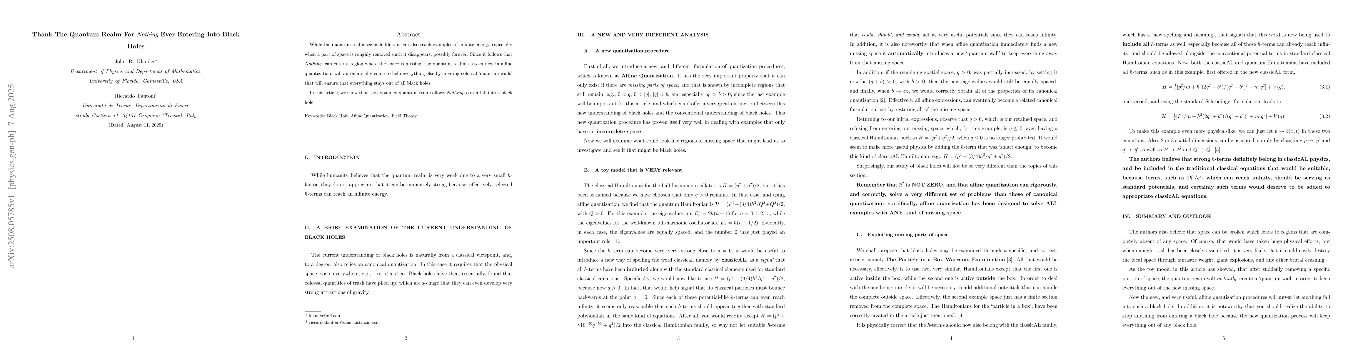 While the quantum realm seems hidden, it can also reach examples of infinite energy, especially when a part of space is roughly removed until it disappears, possibly forever. Since it follows that Nothing can enter a region where the space is missing, the quantum realm, as seen now in affine quantization, will automatically come to help everything else by creating colossal `quantum walls' that will ensure that everything stays out of all black holes. In this article, we show that the expanded quantum realm allows Nothing to ever fall into a black hole.