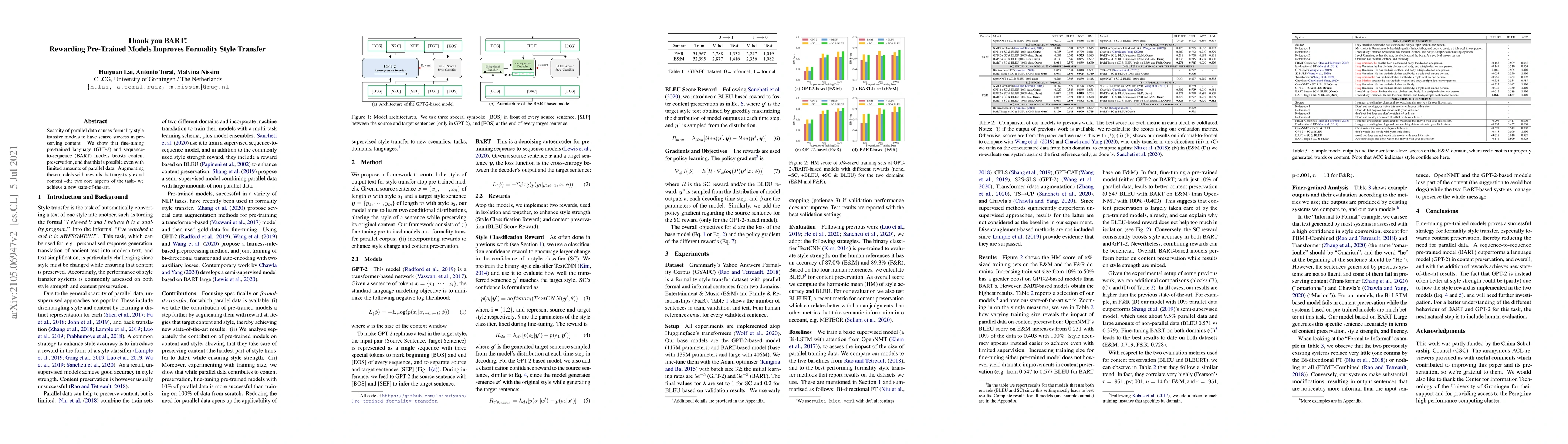 This paper demonstrates that fine-tuning pre-trained language and sequence-to-sequence models, specifically GPT-2 and BART, significantly enhances formality style transfer, even with limited parallel data. By incorporating reward mechanisms focused on style and content, the authors achieve state-of-the-art performance.