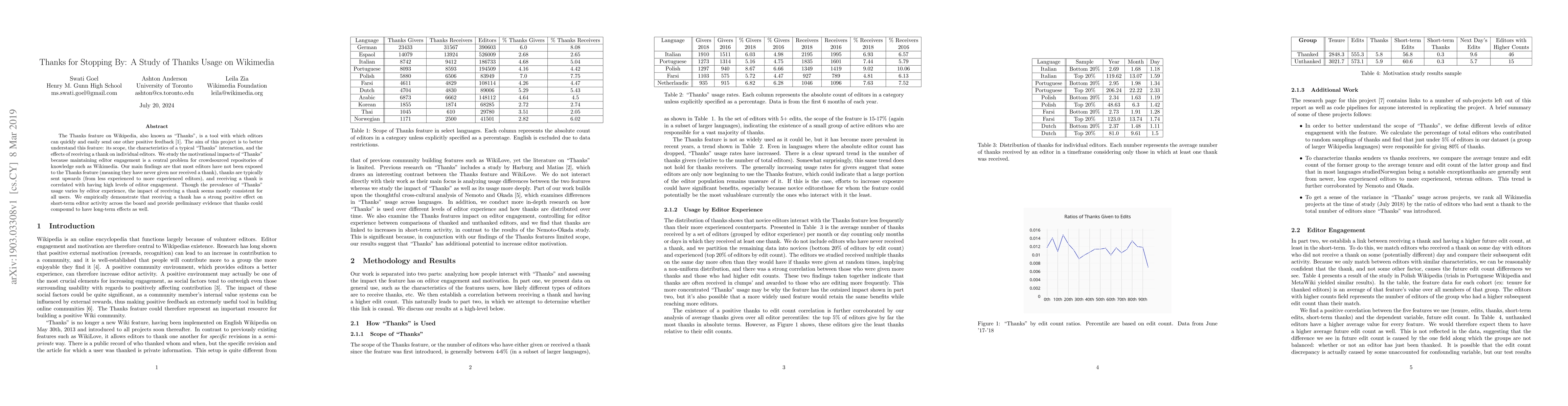 The Thanks feature on Wikipedia, also known as "Thanks", is a tool with which editors can quickly and easily send one other positive feedback. The aim of this project is to better understand this feature: its scope, the characteristics of a typical "Thanks" interaction, and the effects of receiving a thank on individual editors. We study the motivational impacts of "Thanks" because maintaining editor engagement is a central problem for crowdsourced repositories of knowledge such as Wikimedia. Our main findings are that most editors have not been exposed to the Thanks feature (meaning they have never given nor received a thank), thanks are typically sent upwards (from less experienced to more experienced editors), and receiving a thank is correlated with having high levels of editor engagement. Though the prevalence of "Thanks" usage varies by editor experience, the impact of receiving a thank seems mostly consistent for all users. We empirically demonstrate that receiving a thank has a strong positive effect on short-term editor activity across the board and provide preliminary evidence that thanks could compound to have long-term effects as well.
