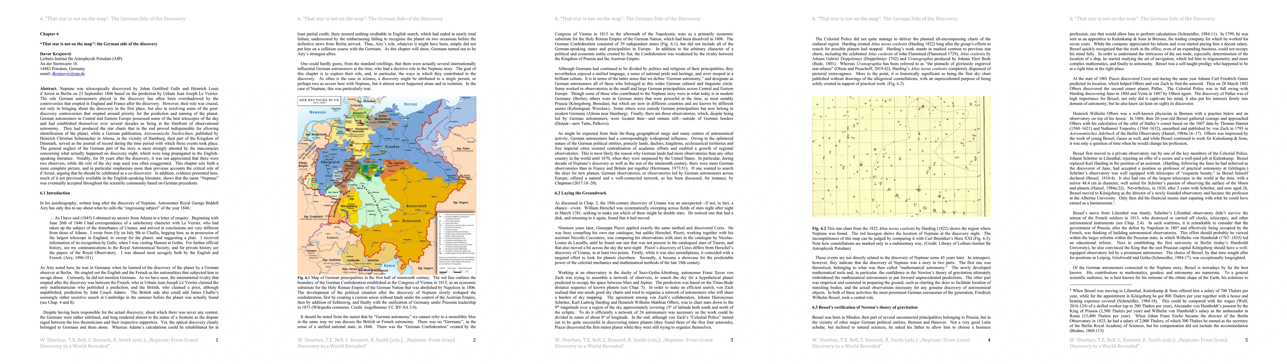 Neptune was telescopically discovered by Johan Gottfried Galle and Heinrich Louis d'Arrest in Berlin on 23 September 1846 based on the prediction by Urbain Jean Joseph Le Verrier. The role German astronomers played in the discovery has often been overshadowed by the controversies that erupted in England and France after the discovery. However, their role was crucial, not only in bringing about the discovery in the first place, but also in resolving some of the post-discovery controversies that erupted around priority for the prediction and naming of the planet. German astronomers in Central and Eastern Europe possessed some of the best telescopes of the day and had established themselves over several decades as being at the forefront of observational astronomy. They had produced the star charts that in the end proved indispensable for allowing identification of the planet, while a German publication, Astronomische Nachrichten, published by H. C. Schumacher in Altona, in the vicinity of Hamburg, then part of the Kingdom of Denmark, served as the journal of record. The general neglect of the German part of the story is most strongly attested by the inaccuracies concerning what actually happened on discovery night, which were long propagated in the English-speaking literature. Notably, for 30 years after the discovery, it was not appreciated that there were two observers, while the role of the sky map used was often exaggerated. This chapter sets forth a more complete picture, and in particular emphasises more than previous accounts the critical role of d'Arrest, arguing that he should be celebrated as a co-discoverer. In addition, evidence presented here, much of it not previously available in the English-speaking literature, shows that the name "Neptune" was eventually accepted throughout the scientific community based on German precedents.