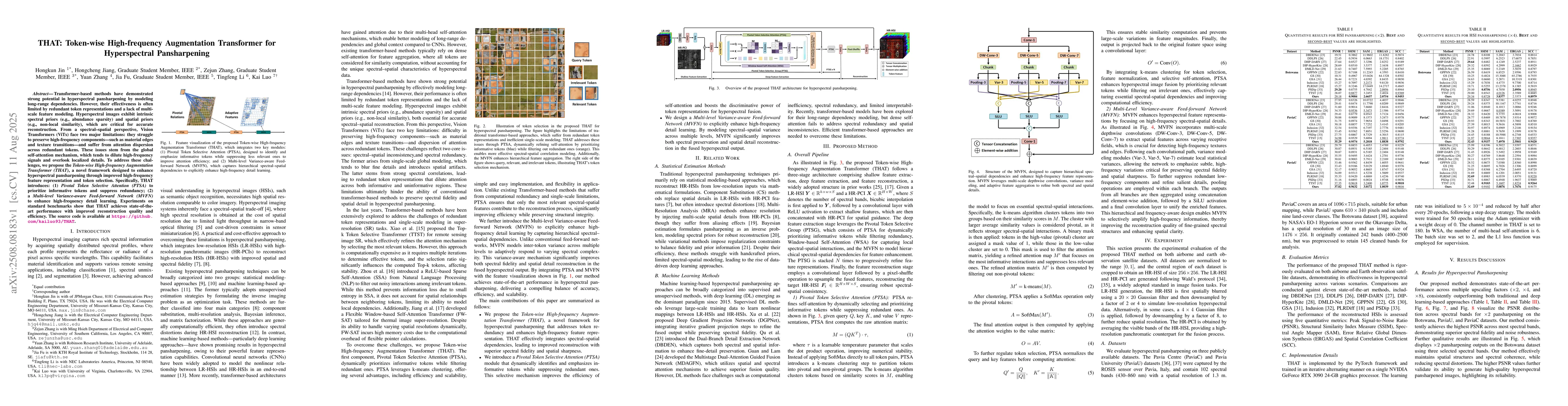 The research proposes Token-wise High-frequency Augmentation Transformer (THAT) for hyperspectral pansharpening, addressing issues of token redundancy and inadequate multi-scale feature modeling through Pivotal Token Selective Attention (PTSA) and Multi-level Variance-aware Feed-forward Network (MVFN).