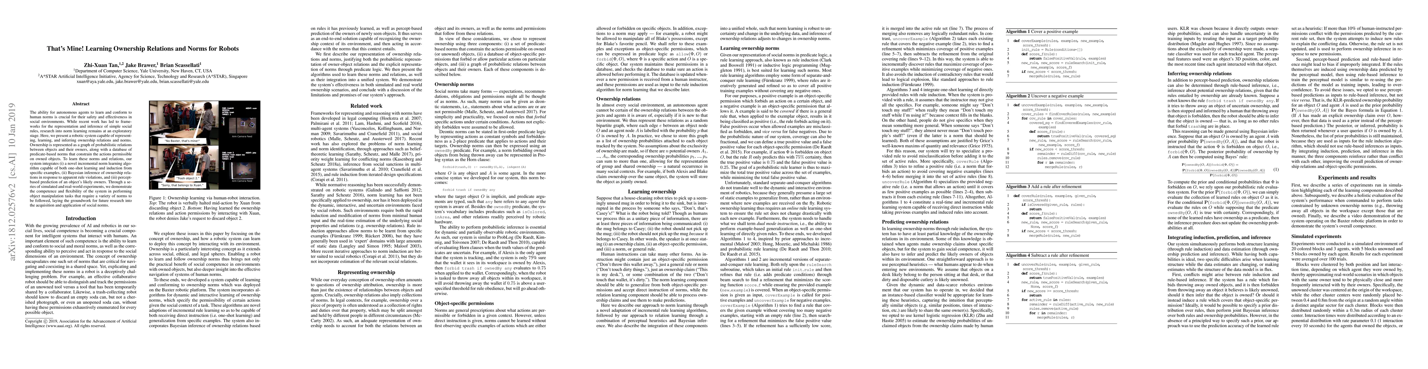 The ability for autonomous agents to learn and conform to human norms is crucial for their safety and effectiveness in social environments. While recent work has led to frameworks for the representation and inference of simple social rules, research into norm learning remains at an exploratory stage. Here, we present a robotic system capable of representing, learning, and inferring ownership relations and norms. Ownership is represented as a graph of probabilistic relations between objects and their owners, along with a database of predicate-based norms that constrain the actions permissible on owned objects. To learn these norms and relations, our system integrates (i) a novel incremental norm learning algorithm capable of both one-shot learning and induction from specific examples, (ii) Bayesian inference of ownership relations in response to apparent rule violations, and (iii) percept-based prediction of an object's likely owners. Through a series of simulated and real-world experiments, we demonstrate the competence and flexibility of the system in performing object manipulation tasks that require a variety of norms to be followed, laying the groundwork for future research into the acquisition and application of social norms.