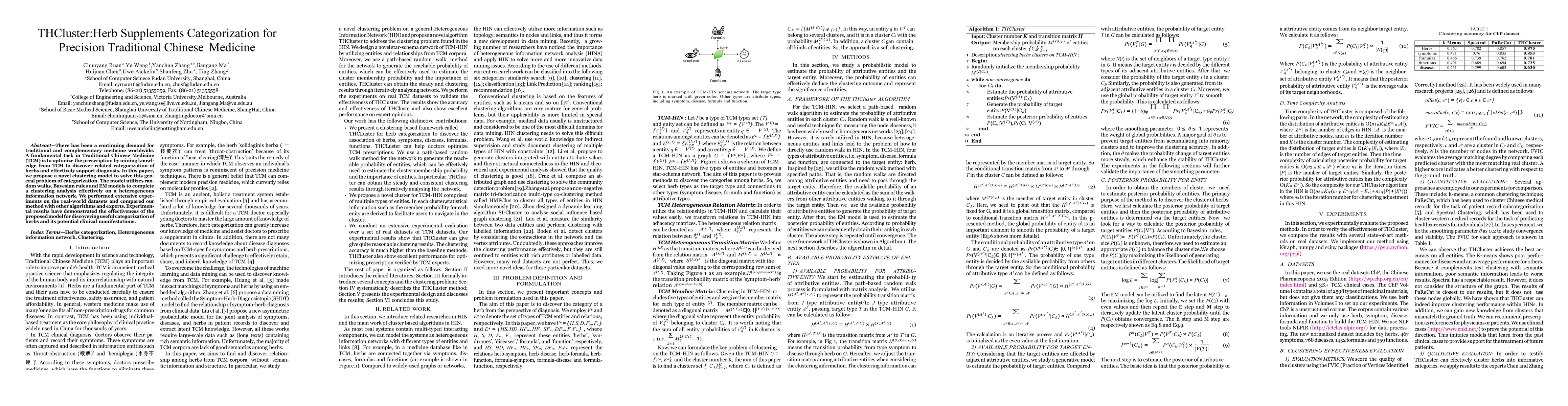 This paper proposes a novel clustering model named THCluster to optimize Traditional Chinese Medicine (TCM) prescriptions by categorizing herbs. The model integrates Random Walks, Bayesian rules, and Expectation Maximization to analyze a heterogeneous information network, demonstrating effectiveness through experiments on real-world datasets.