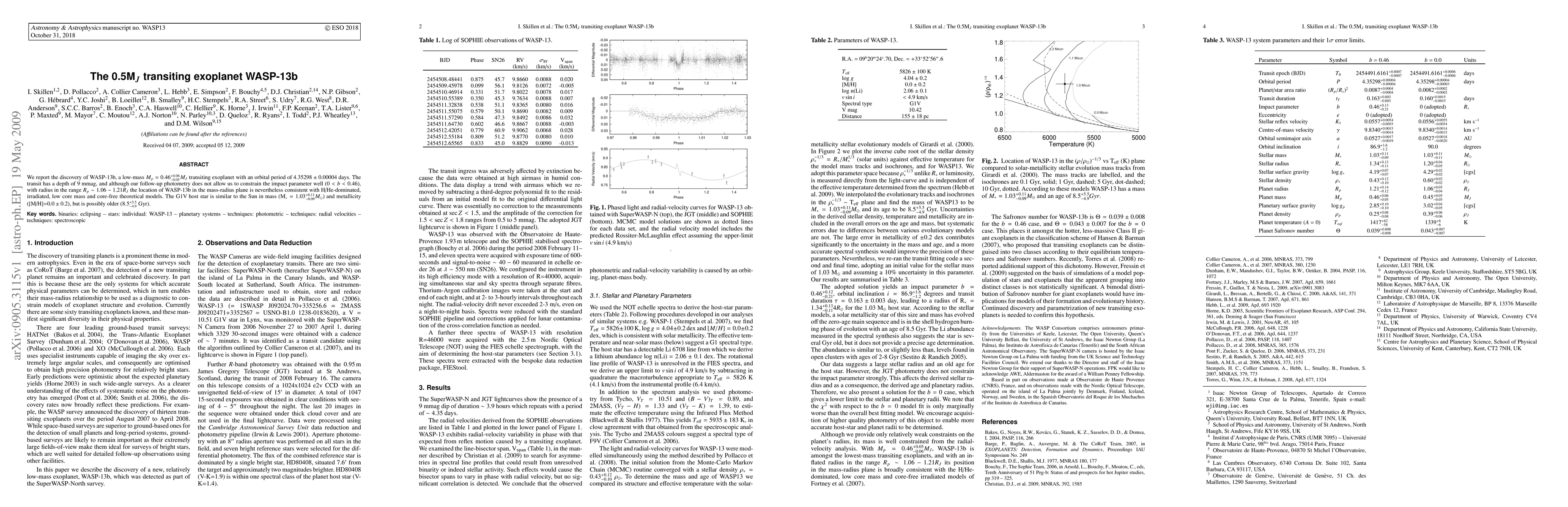 This paper reports the discovery of WASP-13b, a low-mass transiting exoplanet with a mass of 0.46 $M_J$ and an orbital period of 4.35 days. The planet's radius suggests it fits theoretical models of irradiated, low core mass, and core-free compositions.