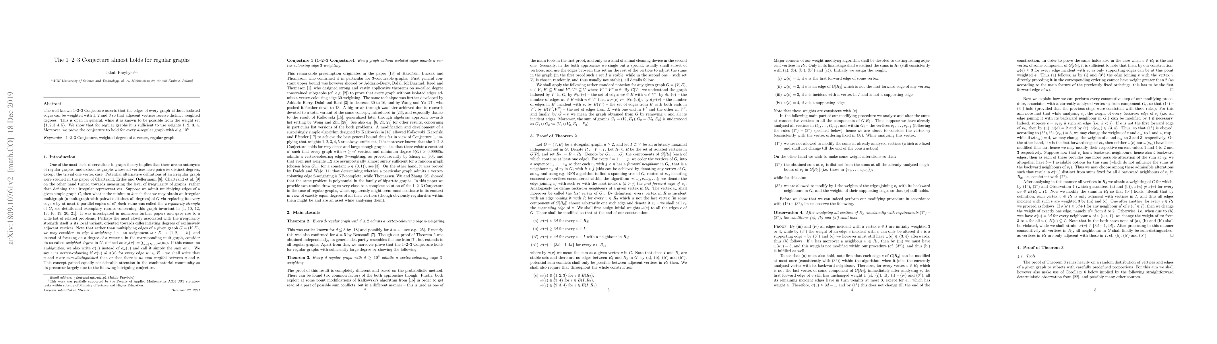 The 1-2-3 Conjecture claims that any graph without isolated edges can have its edges weighted with 1, 2, and 3 such that adjacent vertices have distinct weighted degrees. For regular graphs, the authors demonstrate that weights 1, 2, 3, and 4 suffice, and prove the conjecture true for $d$-regular graphs where $d \geq 10^8$.