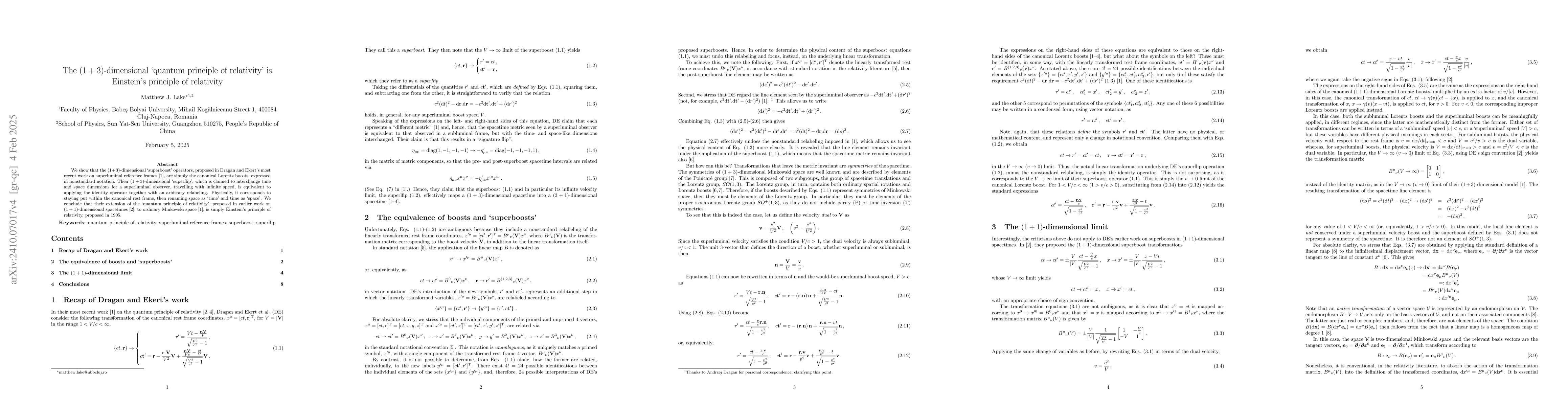 The paper demonstrates that Dragan and Ekert's $(1+3)$-dimensional 'superboost' operators are standard Lorentz boosts in unconventional notation. Their 'superflip', intended to interchange dimensions for superluminal observers, is actually an identity operation with a label change, equivalent to remaining in the rest frame while renaming dimensions. Hence, their proposed extension of the 'quantum principle of relativity' to Minkowski space aligns with Einstein's 1905 principle of relativity.