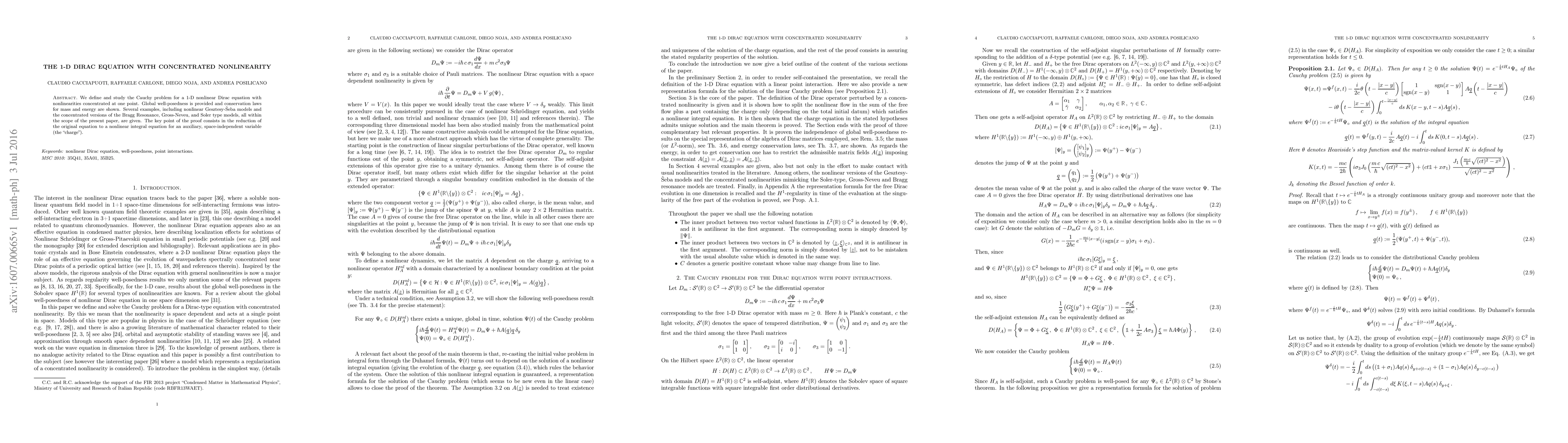 This paper studies a 1-D nonlinear Dirac equation with concentrated nonlinearity, showing global well-posedness and conservation laws for mass and energy, using an auxiliary integral equation to reduce the problem.