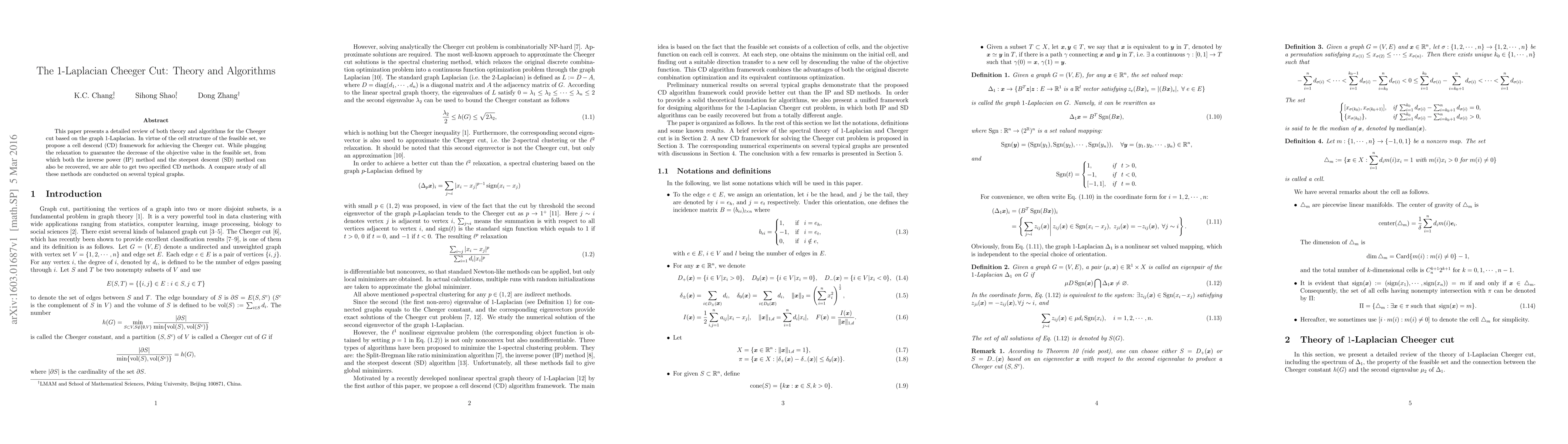 This paper reviews the theory and algorithms for the Cheeger cut based on the graph $1$-Laplacian, proposing a cell descend (CD) framework with two specified methods: inverse power (IP) and steepest descent (SD). Comparative analysis on typical graphs demonstrates the effectiveness of these methods.