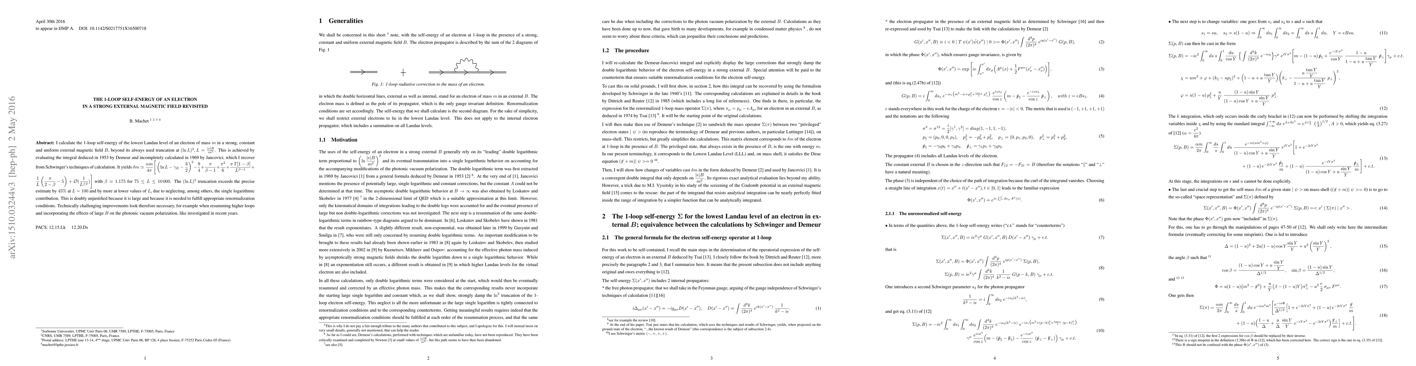 I calculate the 1-loop self-energy of the lowest Landau level an electron of mass m in a strong, constant and uniform external magnetic field B, beyond its always used truncation at (ln L)^2, L=|e|B/m^2. This is achieved by evaluating the integral deduced in 1953 by Demeur and incompletely calculated in 1969 by Jancovici, which I recover from Schwinger's techniques of calculation. It yields \delta m \simeq (\alpha*m/(4*\pi))*[(\ln L -\gamma_E -3/2)^2 -9/4 +\pi/(\beta-1) + \pi^2/6 +\pi*\Gamma[1-\beta]/L^{\beta-1} +(1/L)*(\pi/(2-\beta)-5) +{\cal O}(1/L^{>= 2})] with \beta \approx 1.175 for 75 =< L =< 10000. . The (\ln L)^2 truncation exceeds the precise estimate by 45% at L=100 and by more at lower values of L, due to neglecting, among others, the single logarithmic contribution. This is doubly unjustified because it is large and because it is needed to fulfill appropriate renormalization conditions. Technically challenging improvements look therefore necessary, for example when resumming higher loops and incorporating the effects of large B on the photonic vacuum polarization, like investigated in recent years.