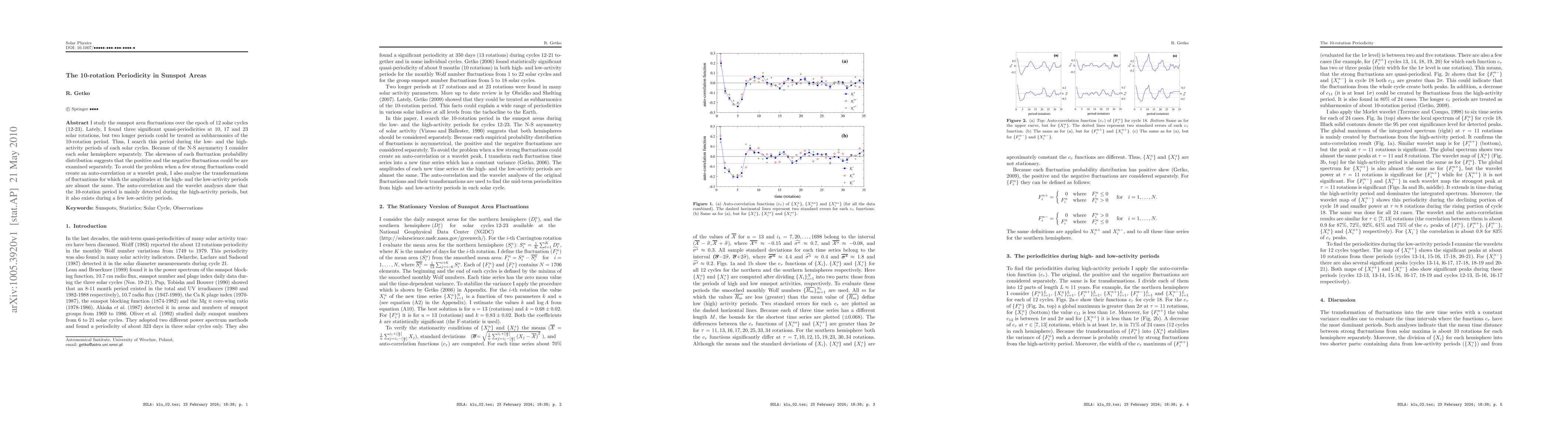 I study the sunspot area fluctuations over the epoch of 12 solar cycles (12-23). Lately, I found three significant quasi-periodicities at 10, 17 and 23 solar rotations, but two longer periods could be treated as subharmonics of the 10-rotation period. Thus, I search this period during the low- and the high-activity periods of each solar cycles. Because of the N-S asymmetry I consider each solar hemisphere separately. The skewness of each fluctuation probability distribution suggests that the positive and the negative fluctuations could be are examined separately. To avoid the problem when a few strong fluctuations could create an auto-correlation or a wavelet peak, I also analyse the transformations of fluctuations for which the amplitudes at the high- and the low-activity periods are almost the same. The auto-correlation and the wavelet analyses show that the 10-rotation period is mainly detected during the high-activity periods, but it also exists during a few low-activity periods.