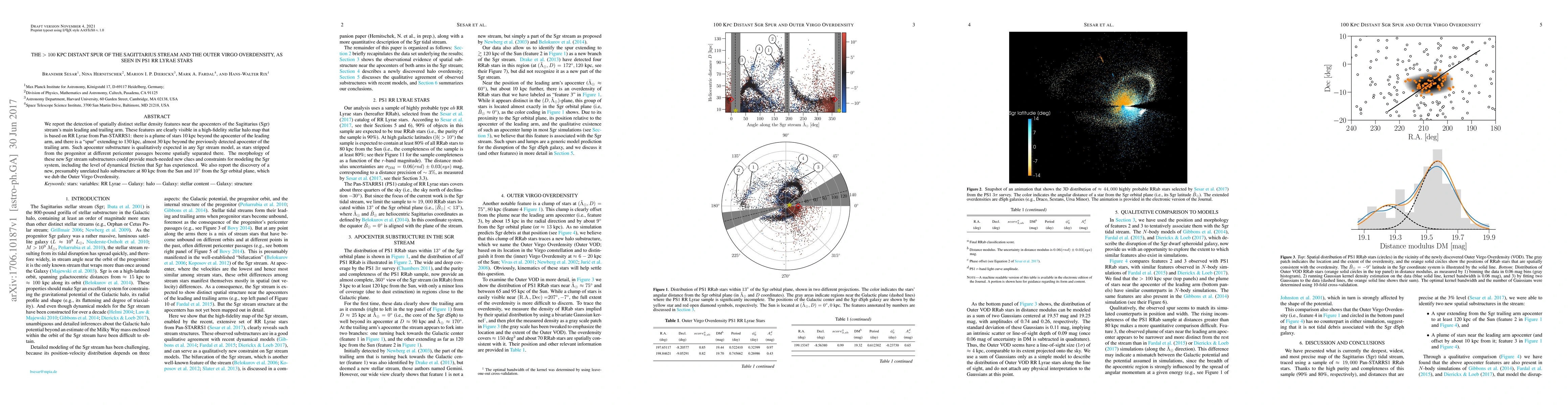 We report the detection of spatially distinct stellar density features near the apocenters of the Sagittarius (Sgr) stream's main leading and trailing arm. These features are clearly visible in a high-fidelity stellar halo map that is based on RR Lyrae from Pan-STARRS1: there is a plume of stars 10 kpc beyond the apocenter of the leading arm, and there is a "spur" extending to 130 kpc, almost 30 kpc beyond the previously detected apocenter of the trailing arm. Such apocenter substructure is qualitatively expected in any Sgr stream model, as stars stripped from the progenitor at different pericenter passages become spatially separated there. The morphology of these new Sgr stream substructures could provide much-needed new clues and constraints for modeling the Sgr system, including the level of dynamical friction that Sgr has experienced. We also report the discovery of a new, presumably unrelated halo substructure at 80 kpc from the Sun and $10^\circ$ from the Sgr orbital plane, which we dub the Outer Virgo Overdensity.
