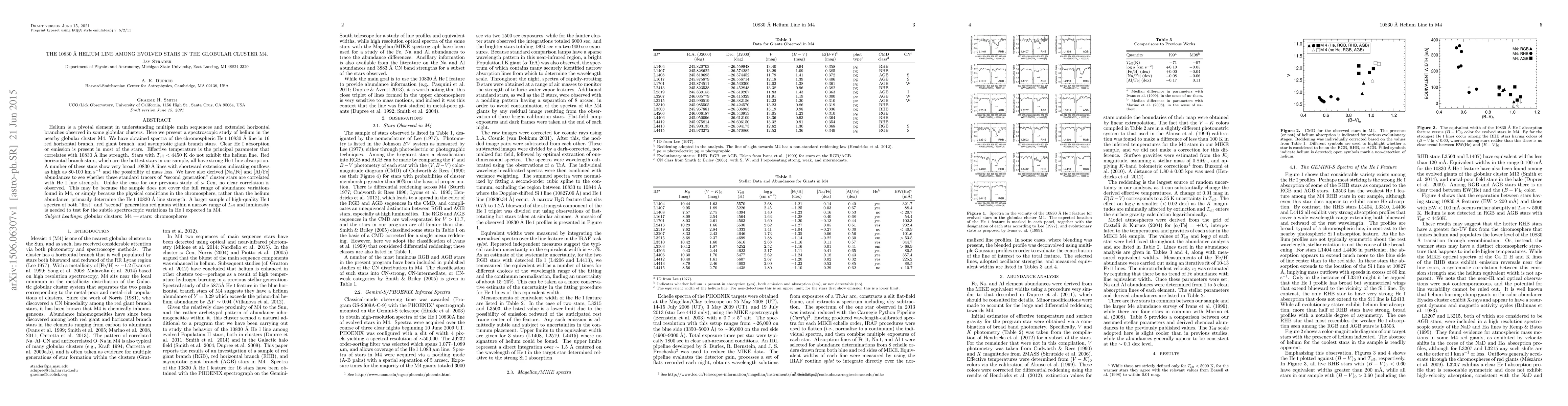 This study investigates the He I 10830 Å line in evolved stars within the globular cluster M4, finding that effective temperature is the main factor correlating with line strength. Red horizontal branch stars exhibit strong He I absorption, with some showing broad lines indicative of high-velocity outflows and mass loss. No clear correlation between "second generation" abundance indicators and He I line strength is observed, suggesting that chromospheric conditions may be more influential than helium abundance.