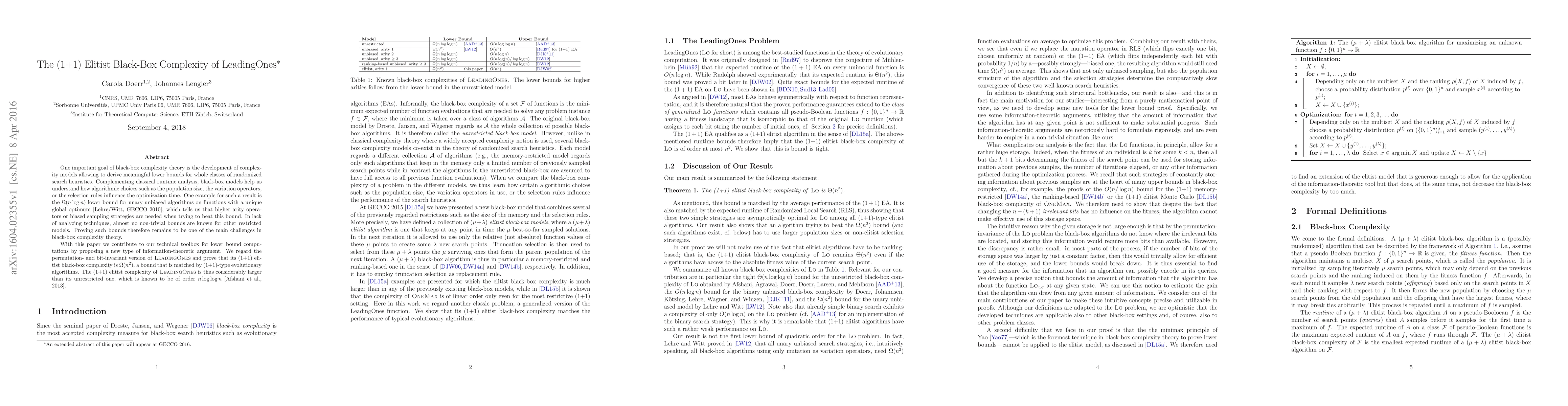 The work presents a novel approach to analyzing the impact of elitist selection on black-box optimization and provides new insights into the optimal complexity of Lo.