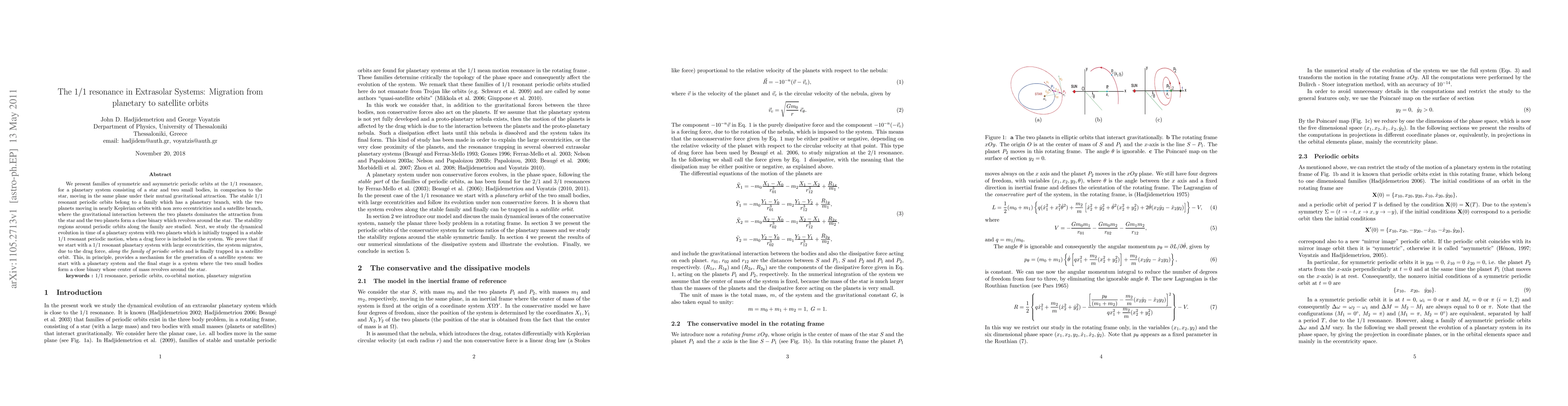 This paper explores the 1:1 resonance in extrasolar systems, demonstrating stable periodic orbits where two small bodies either orbit a star in a planetary configuration or form a close binary satellite system. It shows that systems initially in planetary orbits can migrate to satellite orbits under the influence of drag forces, providing a mechanism for the formation of satellite systems from planetary systems.