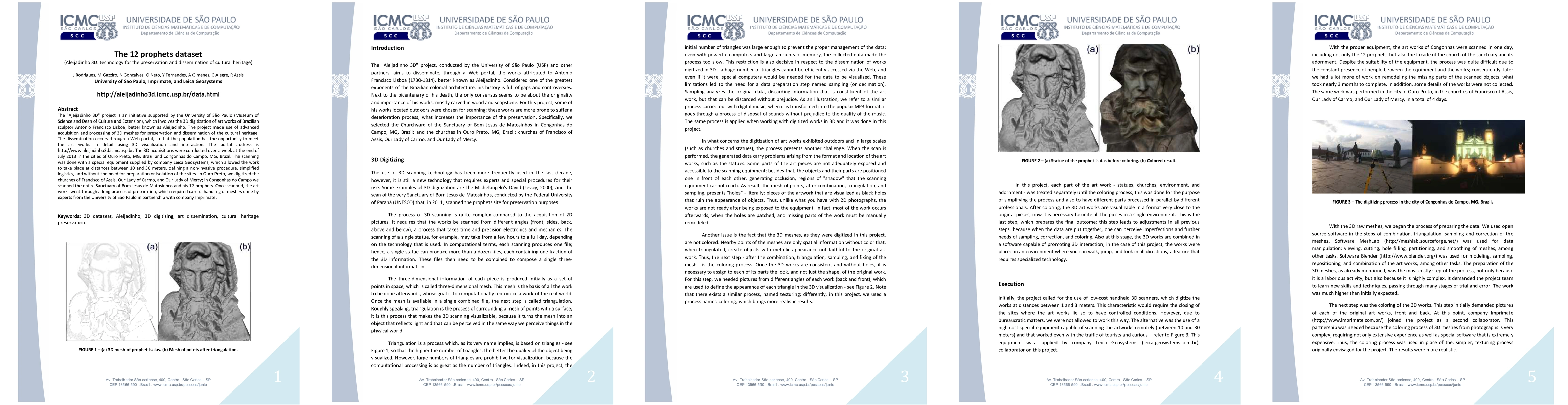The "Ajeijadinho 3D" project is an initiative supported by the University of S\~ao Paulo (Museum of Science and Dean of Culture and Extension), which involves the 3D digitization of art works of Brazilian sculptor Antonio Francisco Lisboa, better known as Aleijadinho. The project made use of advanced acquisition and processing of 3D meshes for preservation and dissemination of the cultural heritage. The dissemination occurs through a Web portal, so that the population has the opportunity to meet the art works in detail using 3D visualization and interaction. The portal address is http://www.aleijadinho3d.icmc.usp.br. The 3D acquisitions were conducted over a week at the end of July 2013 in the cities of Ouro Preto, MG, Brazil and Congonhas do Campo, MG, Brazil. The scanning was done with a special equipment supplied by company Leica Geosystems, which allowed the work to take place at distances between 10 and 30 meters, defining a non-invasive procedure, simplified logistics, and without the need for preparation or isolation of the sites. In Ouro Preto, we digitized the churches of Francisco of Assis, Our Lady of Carmo, and Our Lady of Mercy; in Congonhas do Campo we scanned the entire Sanctuary of Bom Jesus de Matosinhos and his 12 prophets. Once scanned, the art works went through a long process of preparation, which required careful handling of meshes done by experts from the University of S\~ao Paulo in partnership with company Imprimate.