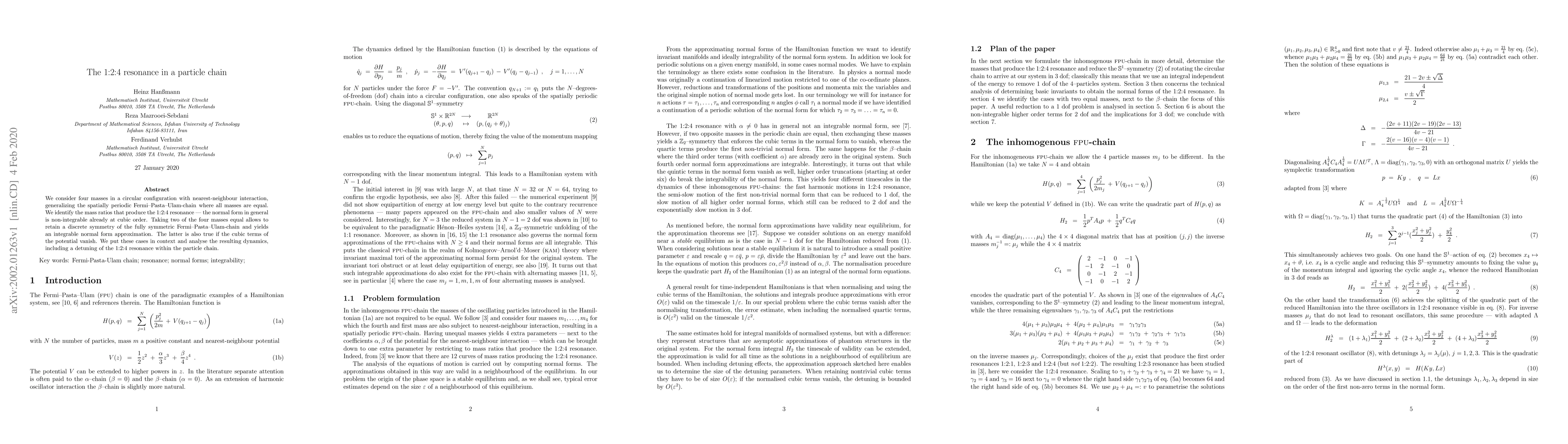 We consider four masses in a circular configuration with nearest-neighbour interaction, generalizing the spatially periodic Fermi--Pasta--Ulam-chain where all masses are equal. We identify the mass ratios that produce the $1{:}2{:}4$~resonance --- the normal form in general is non-integrable already at cubic order. Taking two of the four masses equal allows to retain a discrete symmetry of the fully symmetric Fermi--Pasta--Ulam-chain and yields an integrable normal form approximation. The latter is also true if the cubic terms of the potential vanish. We put these cases in context and analyse the resulting dynamics, including a detuning of the $1{:}2{:}4$~resonance within the particle chain.