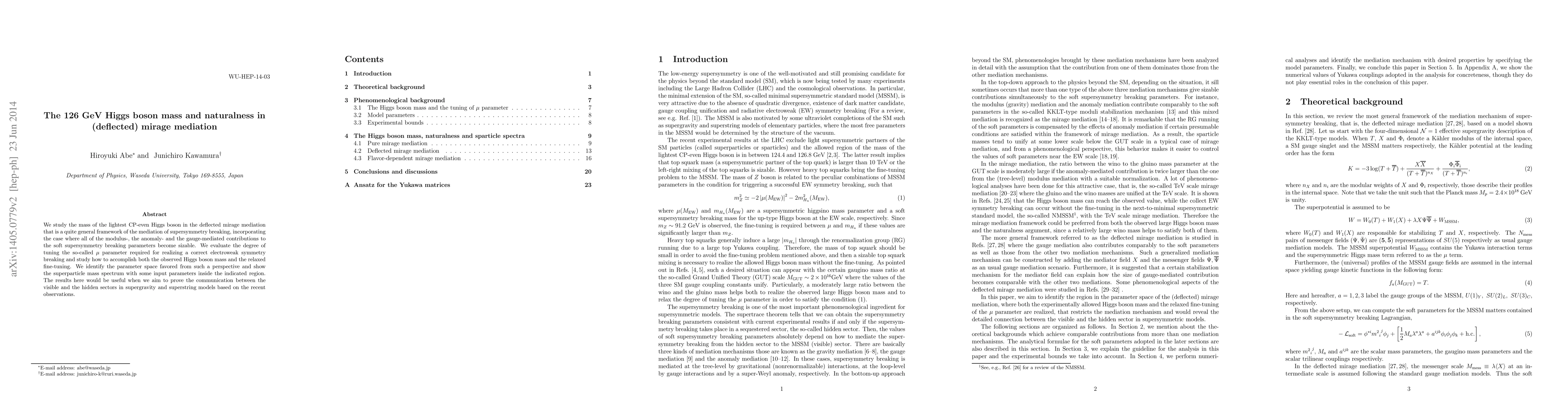 This paper investigates the 126 GeV Higgs boson mass within deflected mirage mediation, a framework for supersymmetry breaking, and examines the balance between achieving correct electroweak symmetry breaking and maintaining naturalness. It identifies the parameter space that allows for both the observed Higgs mass and relaxed fine-tuning, providing insights into the communication between visible and hidden sectors in supergravity and superstring models.
