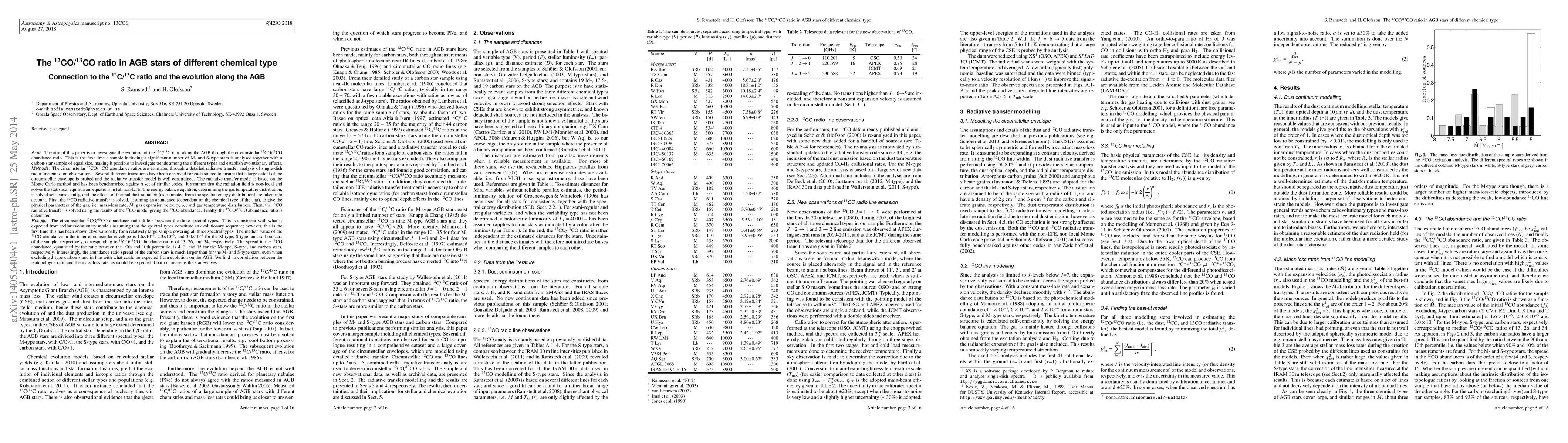 The aim of this paper is to investigate the evolution of the 12C/13C ratio along the AGB through the circumstellar 12CO/13CO ratio. This is the first time a sample including a significant number of M- and S-type stars is analysed together with a carbon-star sample of equal size, making it possible to investigate trends among the different types and establish evolutionary effects. The circumstellar 12CO/13CO abundance ratios are estimated through a detailed radiative transfer analysis of single-dish radio line emission observations. First, the 12CO radiative transfer is solved, assuming an abundance (dependent on the chemical type of the star), to give the physical parameters of the gas, i.e. mass-loss rate, gas expansion velocity, and gas temperature distribution. Then, the 13CO radiative transfer is solved using the results of the 12CO model giving the 13CO abundance. Finally, the 12CO/13CO abundance ratio is calculated. The circumstellar 12CO/13CO abundance ratio differs between the three spectral types. This is consistent with what is expected from stellar evolutionary models assuming that the spectral types constitute an evolutionary sequence; however, this is the first time this has been shown observationally for a relatively large sample covering all three spectral types. The median value of the 13CO abundance in the inner circumstellar envelope is 1.6x10^-5, 2.3x10^-5, and 3.0x10^-5 for the M-type, S-type, and carbon stars of the sample, respectively, corresponding to 12CO/13CO abundance ratios of 13, 26, and 34, respectively. Interestingly, the abundance ratio spread of the carbon stars is much larger than for the M- and S-type stars, even when excluding J-type carbon stars, in line with what could be expected from evolution on the AGB. We find no correlation between the isotopologue ratio and the mass-loss rate, as would be expected if both increase as the star evolves.