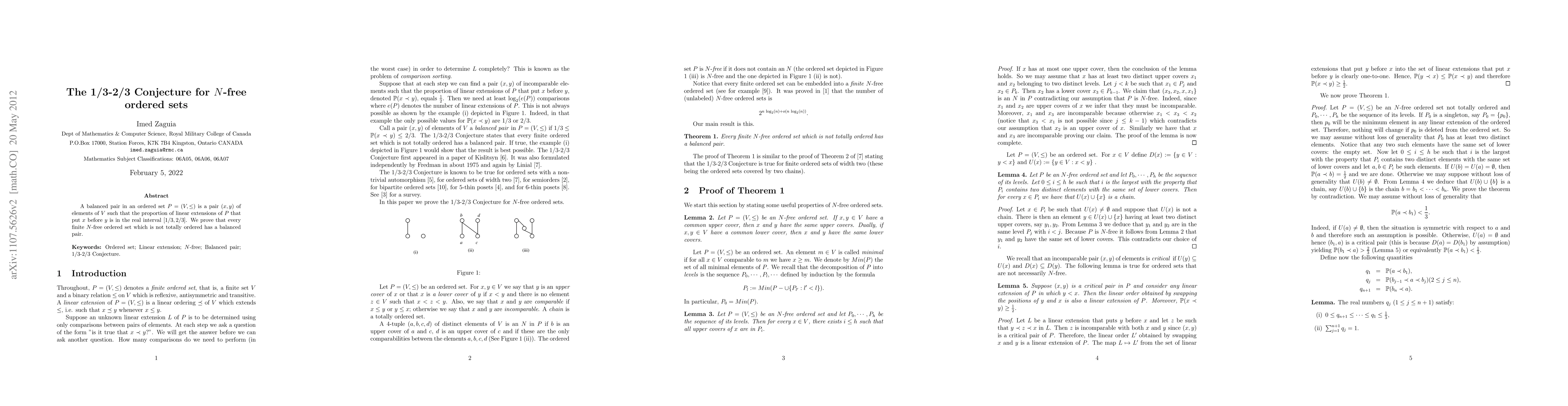 A balanced pair in a finite ordered set $P=(V,\leq)$ is a pair $(x,y)$ of elements of $V$ such that the proportion of linear extensions of $P$ that put $x$ before $y$ is in the real interval $[1/3, 2/3]$. We prove that every finite $N$-free ordered set which is not totally ordered has a balanced pair.