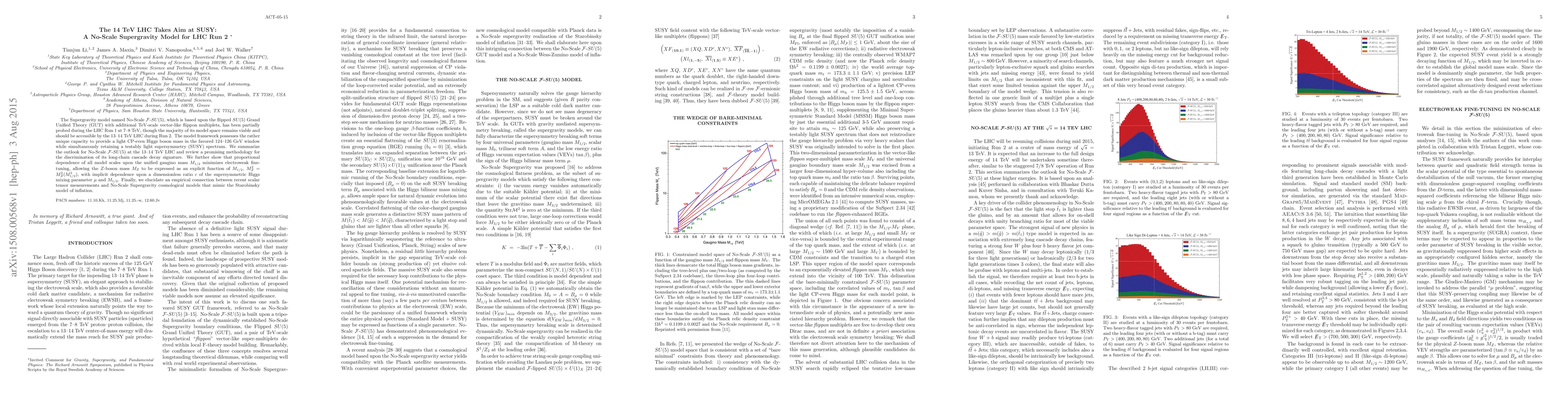 The Supergravity model named No-Scale ${\cal F}$-$SU(5)$, which is based upon the flipped $SU$(5) Grand Unified Theory (GUT) with additional TeV-scale vector-like flippon multiplets, has been partially probed during the LHC Run 1 at 7-8 TeV, though the majority of its model space remains viable and should be accessible by the 13-14 TeV LHC during Run 2. The model framework possesses the rather unique capacity to provide a light CP-even Higgs boson mass in the favored 124-126 GeV window while simultaneously retaining a testably light supersymmetry (SUSY) spectrum. We summarize the outlook for No-Scale ${\cal F}$-$SU(5)$ at the 13-14 TeV LHC and review a promising methodology for the discrimination of its long-chain cascade decay signature. We further show that proportional dependence of all model scales upon the unified gaugino mass $M_{1/2}$ minimizes electroweak fine-tuning, allowing the $Z$-boson mass $M_Z$ to be expressed as an explicit function of $M_{1/2}$, $M_Z^2 = M_Z^2 (M_{1/2}^2)$, with implicit dependence upon a dimensionless ratio $c$ of the supersymmetric Higgs mixing parameter $\mu$ and $M_{1/2}$. Finally, we elucidate an empirical connection between recent scalar tensor measurements and No-Scale Supergravity cosmological models that mimic the Starobinsky model of inflation.