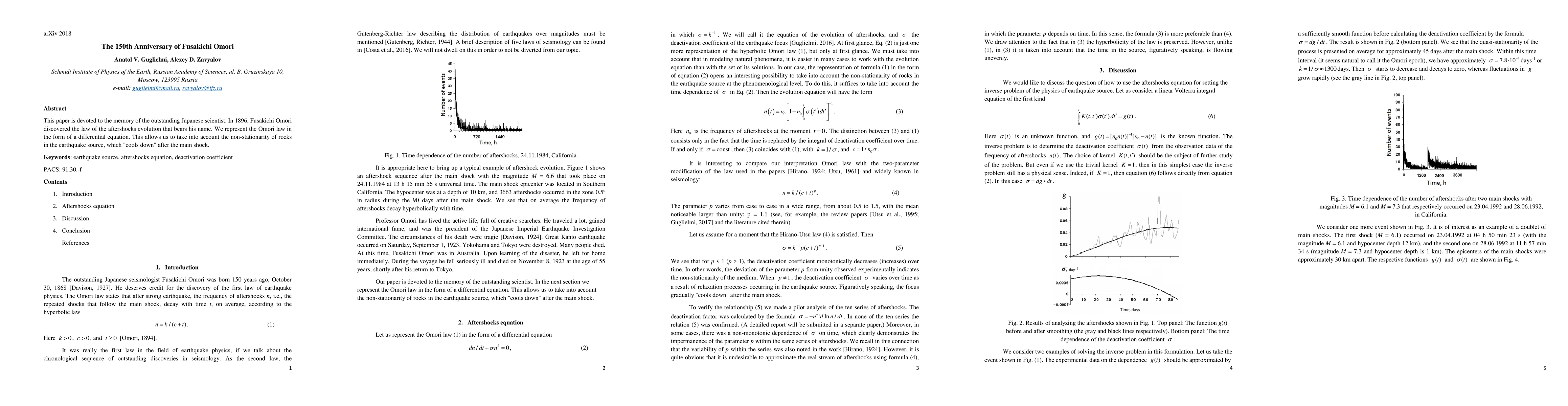 The paper commemorates Japanese scientist Fusakichi Omori, who in 1896 formulated the Omori law describing aftershock evolution, represented as a differential equation to account for the changing conditions of rocks post-main shock. This law continues to inform earthquake research.
