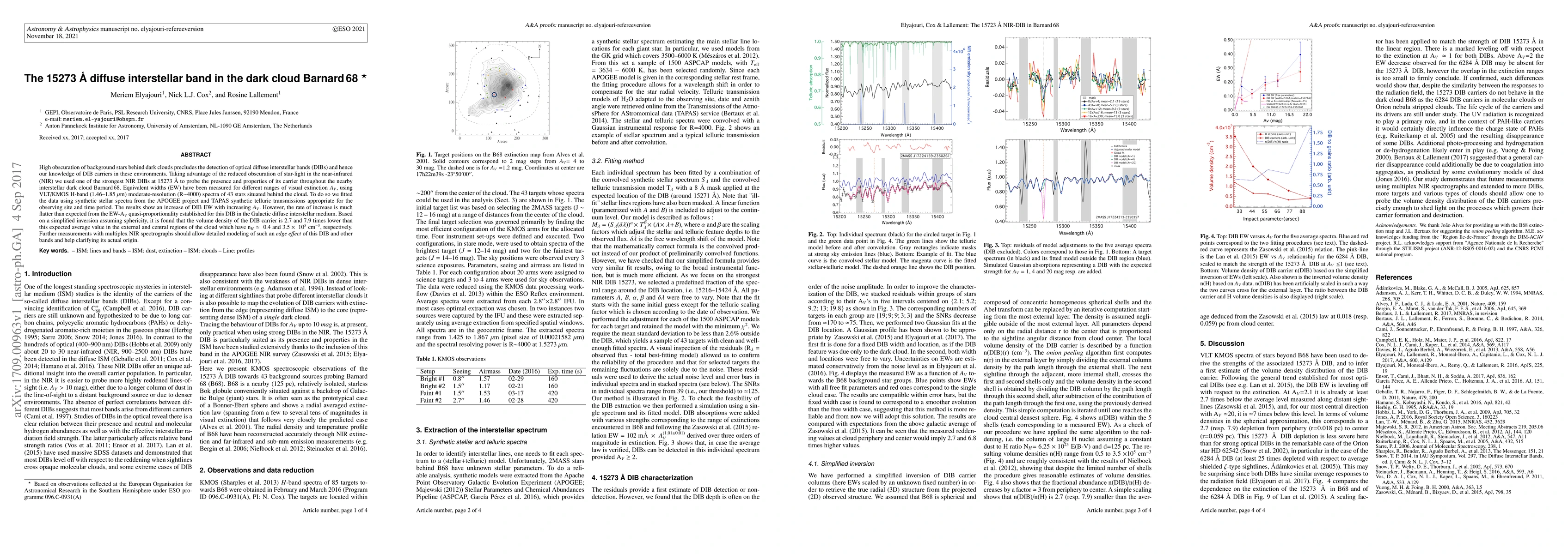 High obscuration of background stars behind dark clouds precludes the detection of optical diffuse interstellar bands (DIBs) and hence our knowledge of DIB carriers in these environments. Taking advantage of the reduced obscuration of star-light in the near-infrared (NIR) we used one of the strongest NIR DIBs at 15273 AA to probe the presence and properties of its carrier throughout the nearby interstellar dark cloud Barnard 68. Equivalent widths (EW) have been measured for different ranges of visual extinction AV, using VLT-KMOS H-band (1.46-1.85 micron) moderate-resolution (R = 4000) spectra of 43 stars situated behind the cloud. To do so we fitted the data using synthetic stellar spectra from the APOGEE project and TAPAS synthetic telluric transmissions appropriate for the observing site and time period. The results show an increase of DIB EW with increasing AV. However, the rate of increase is much flatter than expected from the EW-AV quasi-proportionality established for this DIB in the Galactic diffuse interstellar medium. Based on a simplified inversion assuming sphericity, it is found that the volume density of the DIB carrier is 2.7 and 7.9 times lower than this expected average value in the external and central regions of the cloud which have n(H)= 0.4 and 3.5 x 105 cm3, respectively. Further measurements with multiplex NIR spectrographs should allow detailed modeling of such an edge effect of this DIB and other bands and help to clarify its actual origin.