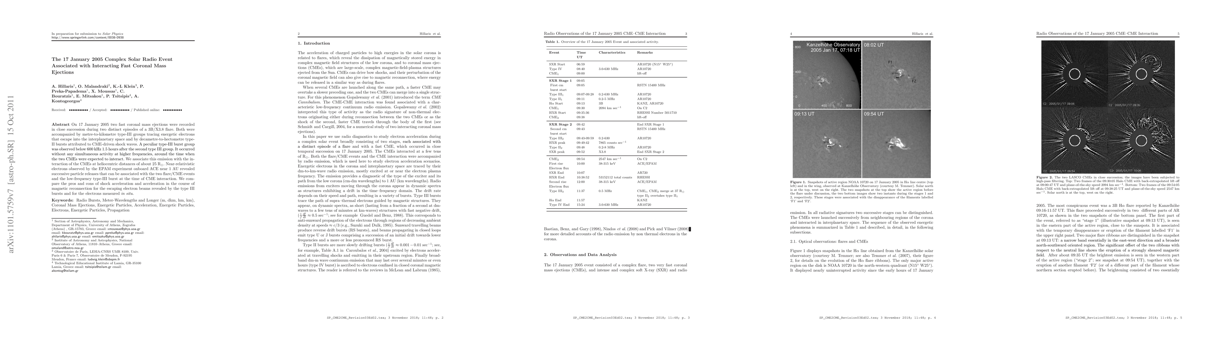 This paper investigates the 17 January 2005 complex solar radio event linked to interacting fast coronal mass ejections (CMEs), revealing unique low-frequency type-III bursts and near-relativistic electron releases, and discusses the mechanisms behind these phenomena. The study compares shock acceleration and magnetic reconnection as potential sources of the observed energetic electrons.