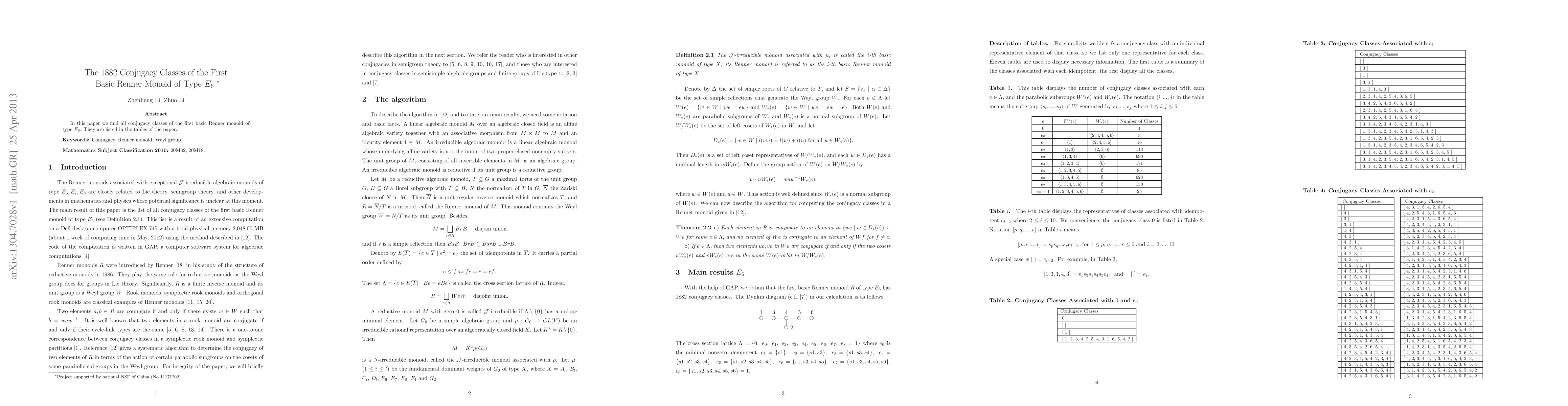 This paper identifies and tabulates all conjugacy classes of the first basic Renner monoid of type E_6, providing a comprehensive classification of its structural elements. The detailed results are presented in tabular form for easy reference.