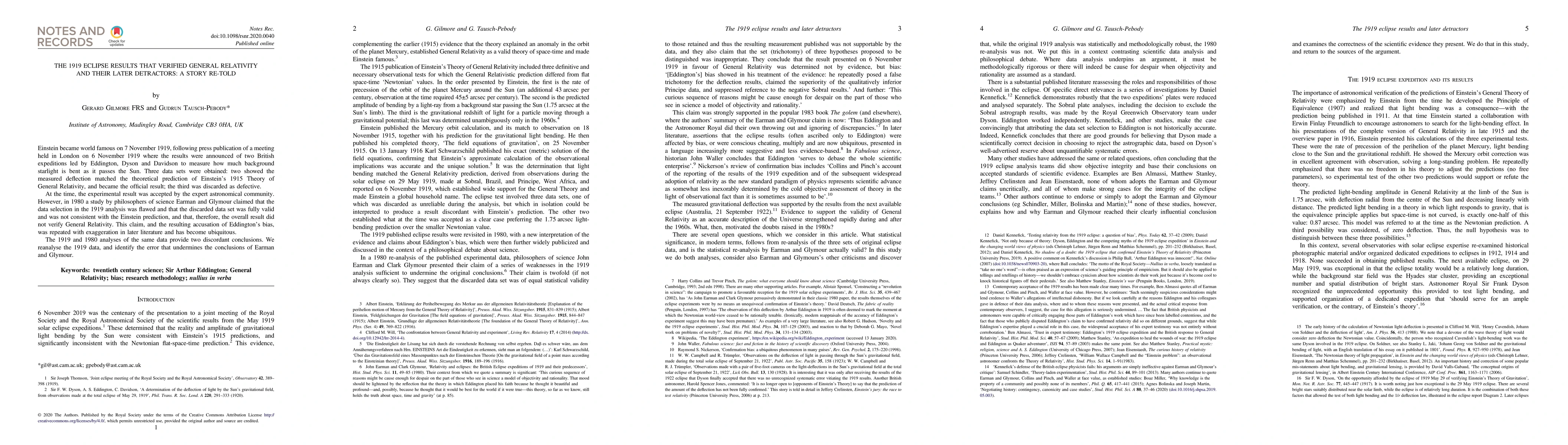 Einstein became world-famous on 7 November 1919, following press publication of a meeting held in London on 6 November 1919 where the results were announced of two British expeditions led by Eddington, Dyson and Davidson to measure how much background starlight is bent as it passes the Sun. Three data sets were obtained: two showed the measured deflection matched the theoretical prediction of Einstein's 1915 Theory of General Relativity, and became the official result; the third was discarded as defective. At the time, the experimental result was accepted by the expert astronomical community. However, in 1980 a study by philosophers of science Earman and Glymour claimed that the data selection in the 1919 analysis was flawed and that the discarded data set was fully valid and was not consistent with the Einstein prediction, and that, therefore, the overall result did not verify General Relativity. This claim, and the resulting accusation of Eddington's bias, was repeated with exaggeration in later literature, and has become ubiquitous. The 1919 and 1980 analyses of the same data provide two discordant conclusions. We reanalyse the 1919 data, and identify the error that undermines the conclusions of Earman and Glymour.