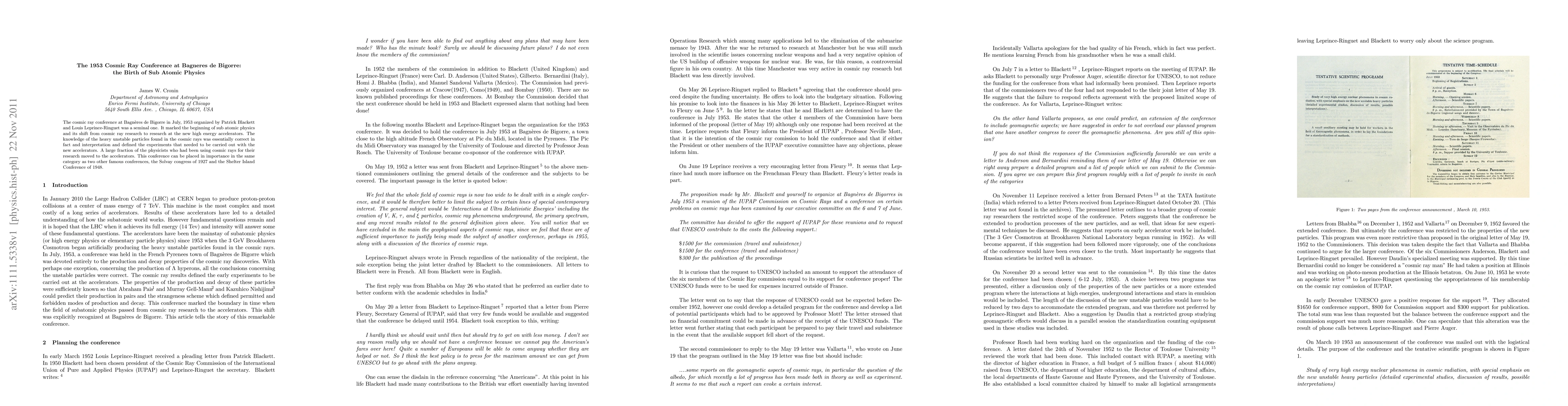 The cosmic ray conference at Bagn`eres de Bigorre in July, 1953 organized by Patrick Blackett and Louis Leprince-Ringuet was a seminal one. It marked the beginning of sub atomic physics and its shift from cosmic ray research to research at the new high energy accelerators. The knowledge of the heavy unstable particles found in the cosmic rays was essentially correct in fact and interpretation and defined the experiments that needed to be carried out with the new accelerators. A large fraction of the physicists who had been using cosmic rays for their research moved to the accelerators. This conference can be placed in importance in the same category as two other famous conferences, the Solvay congress of 1927 and the Shelter Island Conference of 1948.