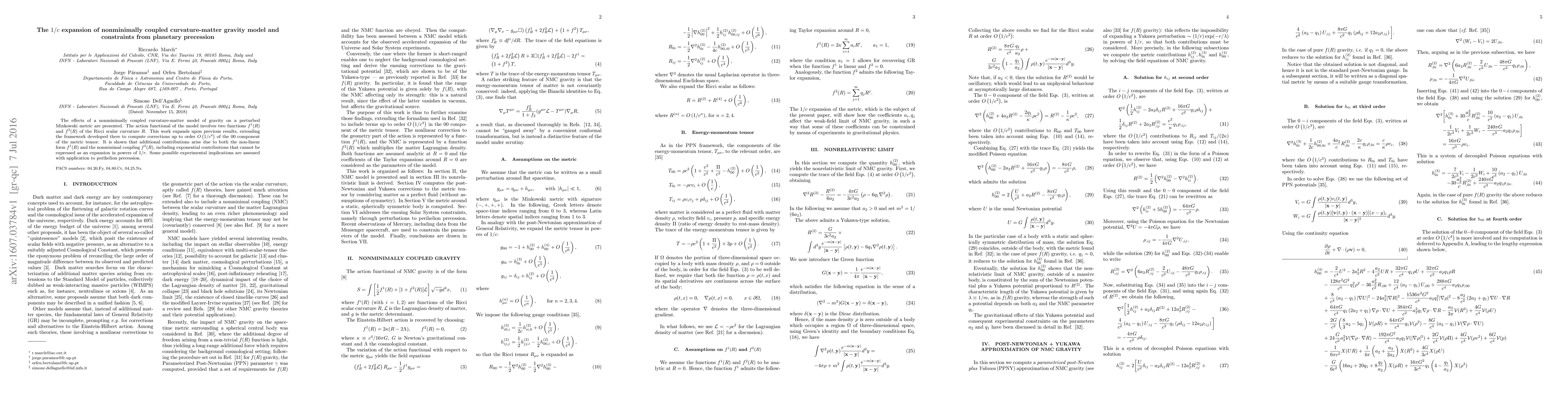 This paper explores the effects of a nonminimally coupled curvature-matter model of gravity on a perturbed Minkowski metric, extending the framework to compute $O(1/c^4)$ corrections in the $00$ component of the metric tensor. It identifies additional contributions from both $f^1(R)$ and $f^2(R)$, and assesses potential experimental implications for planetary precession.