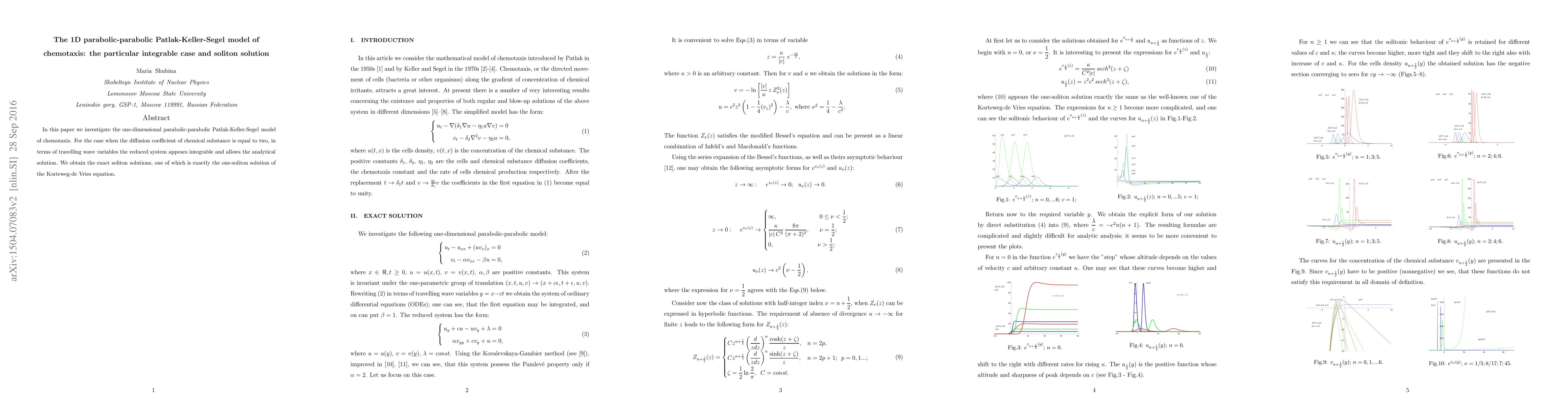 This paper explores the one-dimensional parabolic-parabolic Patlak-Keller-Segel model for chemotaxis, revealing an integrable case when the diffusion coefficient equals two. The authors derive exact soliton solutions, including a one-soliton solution analogous to the Korteweg-de Vries equation.