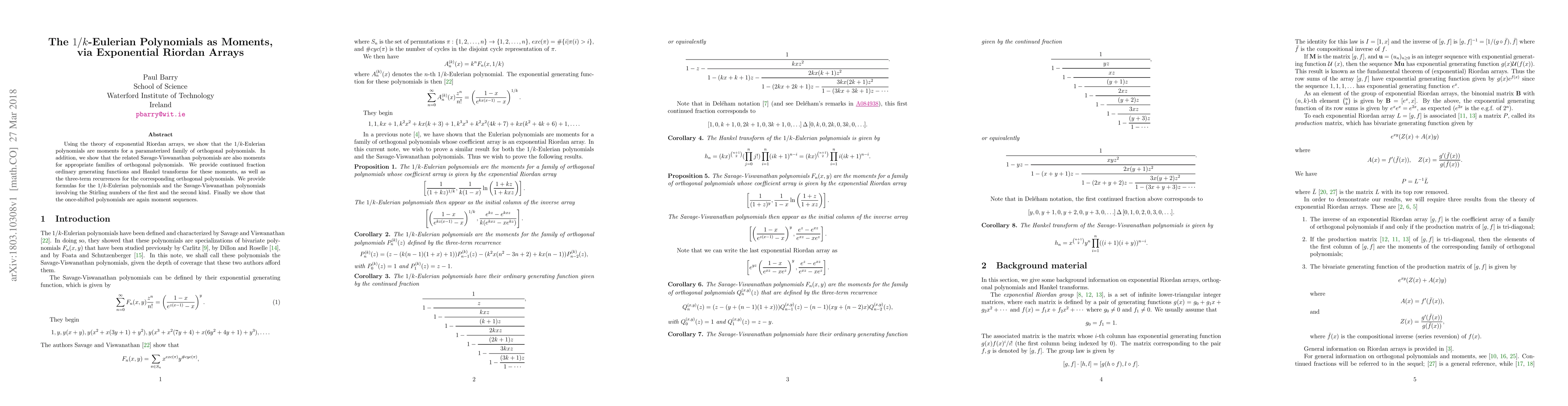 This paper utilizes exponential Riordan arrays to demonstrate that $1/k$-Eulerian polynomials and Savage-Viswanathan polynomials serve as moments for specific families of orthogonal polynomials. It also provides generating functions, recurrence relations, and connections to Stirling numbers.