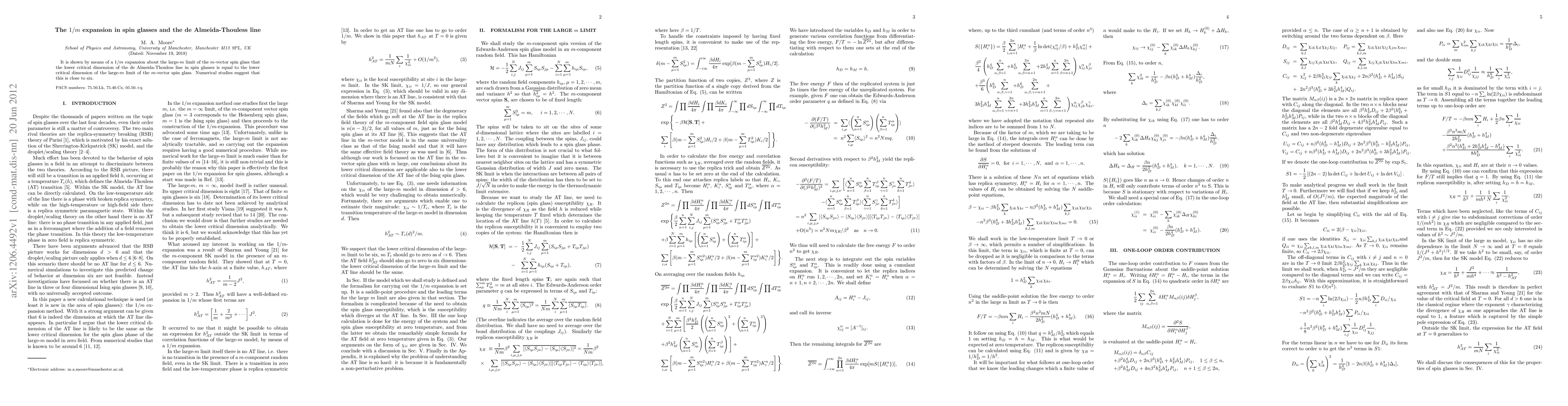 It is shown by means of a 1/m expansion about the large-m limit of the m-vector spin glass that the lower critical dimension of the de Almeida-Thouless line in spin glasses is equal to the lower critical dimension of the large-m limit of the m-vector spin glass. Numerical studies suggest that this is close to six.