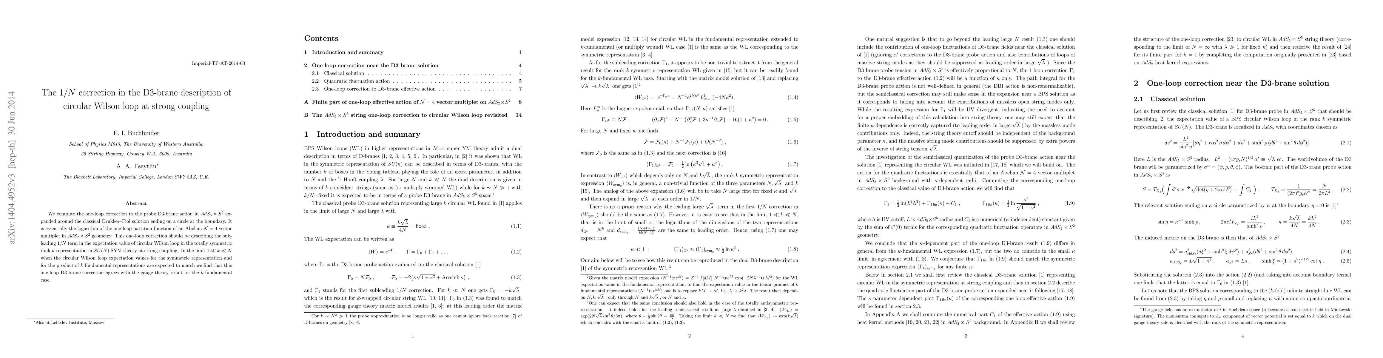 This paper computes the one-loop correction to the D3-brane action in AdS5 x S5, revealing the 1/N correction in the expectation value of circular Wilson loops in SU(N) SYM theory at strong coupling. The results match the gauge theory prediction for the product of k fundamental representations when k is much smaller than N.