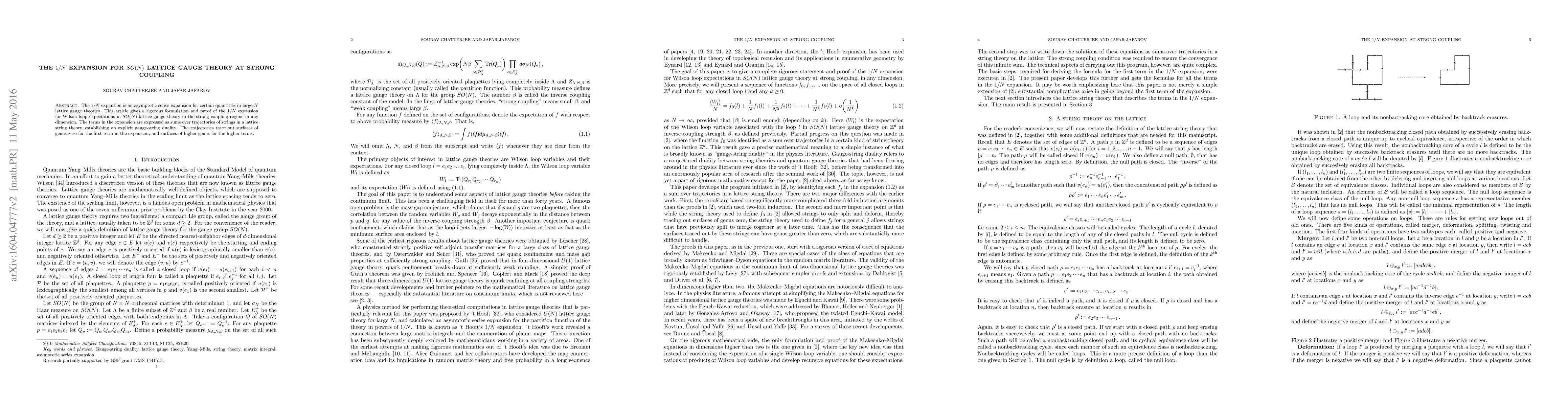This paper rigorously formulates and proves the $1/N$ expansion for SO(N) lattice gauge theory at strong coupling, expressing terms as sums over lattice string trajectories that trace out surfaces of increasing genus. It establishes a gauge-string duality.
