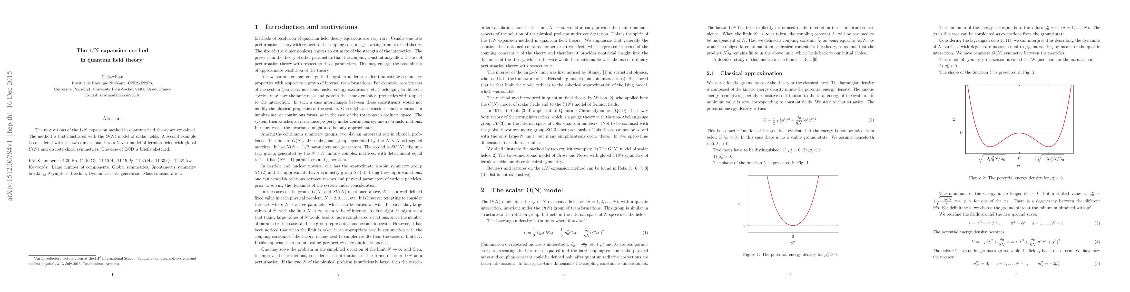 The 1/N expansion method in quantum field theory is explored, demonstrating its application through the O(N) scalar model and the two-dimensional Gross-Neveu model, while briefly touching on its relevance in Quantum Chromodynamics (QCD).