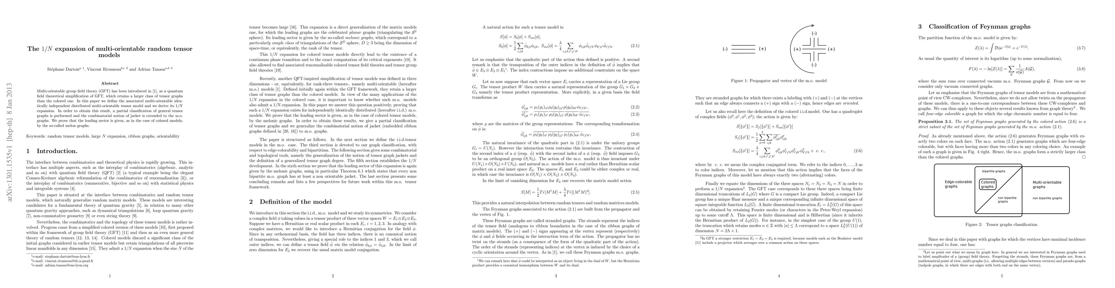 Multi-orientable group field theory (GFT) has been introduced in A. Tanasa, J. Phys. A 45 (2012) 165401, arXiv:1109.0694, as a quantum field theoretical simplification of GFT, which retains a larger class of tensor graphs than the colored one. In this paper we define the associated multi-orientable identically independent distributed multi-orientable tensor model and we derive its 1/N expansion. In order to obtain this result, a partial classification of general tensor graphs is performed and the combinatorial notion of jacket is extended to the multi-orientable graphs. We prove that the leading sector is given, as in the case of colored models, by the so-called melon graphs.