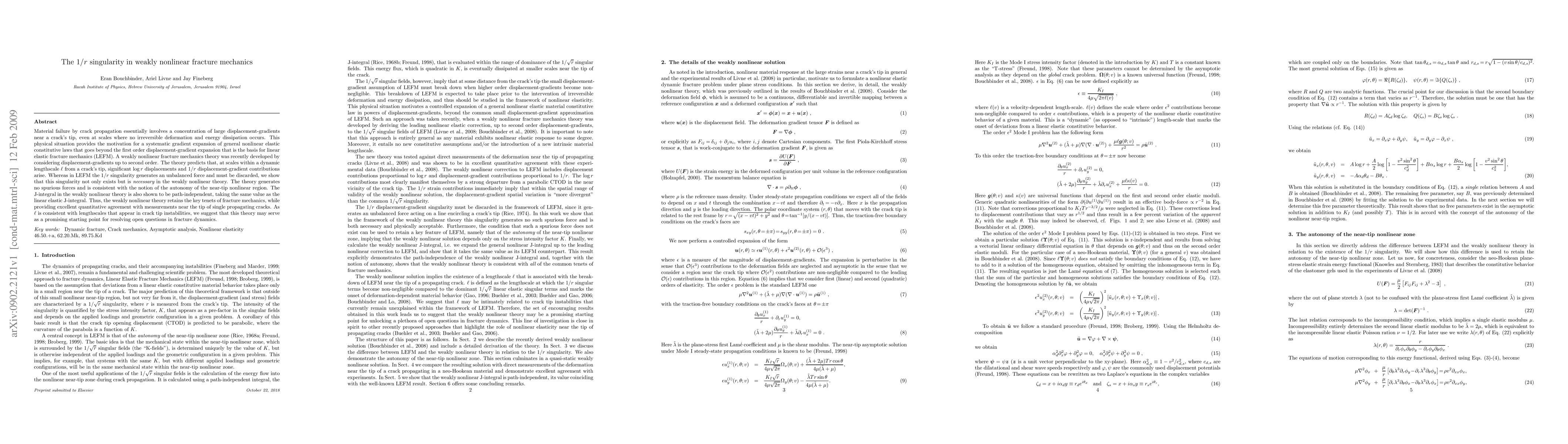 This paper develops a weakly nonlinear fracture mechanics theory that accounts for higher-order displacement gradients, showing that the previously discarded $1/r$ singularity is necessary and provides no spurious forces. The theory retains the J-integral's path-independence and aligns well with experimental measurements near crack tips, suggesting potential for resolving fracture dynamics questions.
