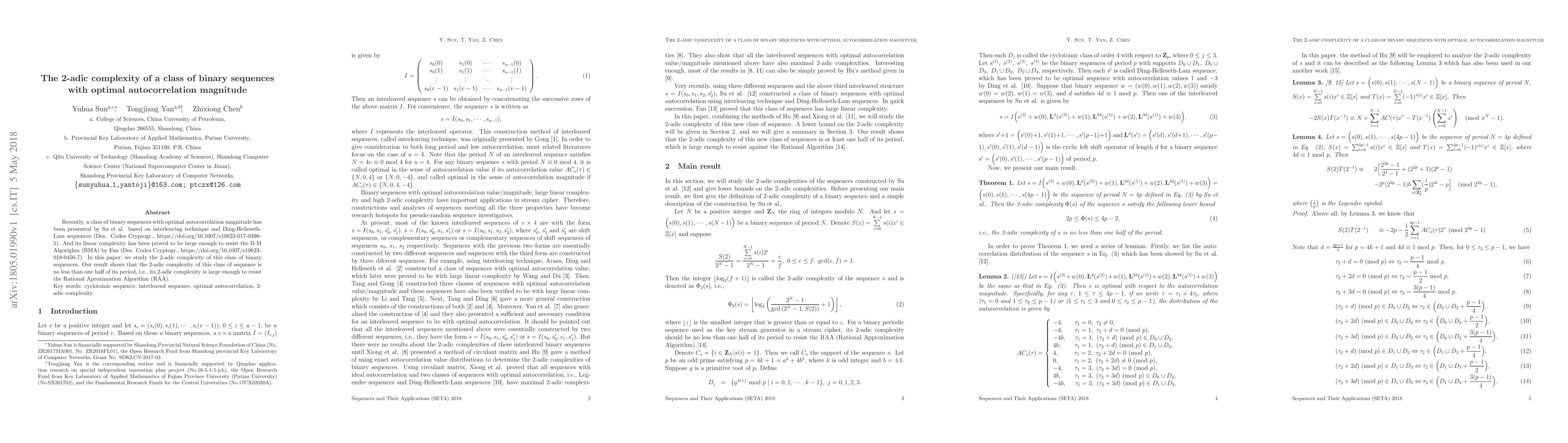 This paper investigates the 2-adic complexity of a class of binary sequences with optimal autocorrelation, previously developed by Su et al. The study finds that the 2-adic complexity is at least half the sequence's period, ensuring it is sufficiently large to resist the Rational Approximation Algorithm (RAA).