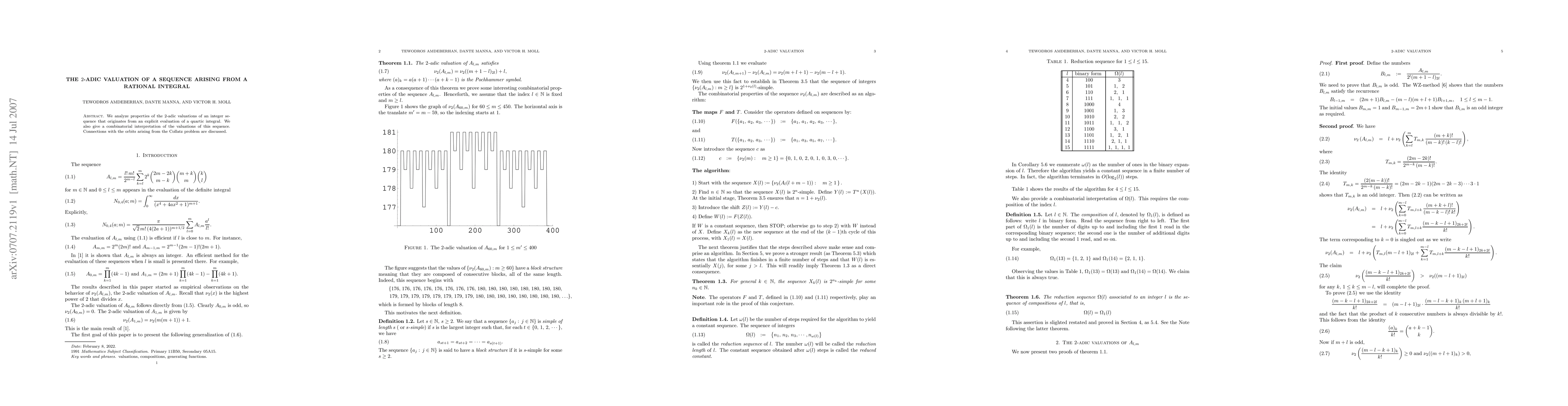 We analyze properties of the 2-adic valuations of an integer sequence that originates from an explicit evaluation of a quartic integral. We also give a combinatorial interpretation of the valuations of this sequence. Connections with the orbits arising from the Collatz (3x+1) problem are discussed.