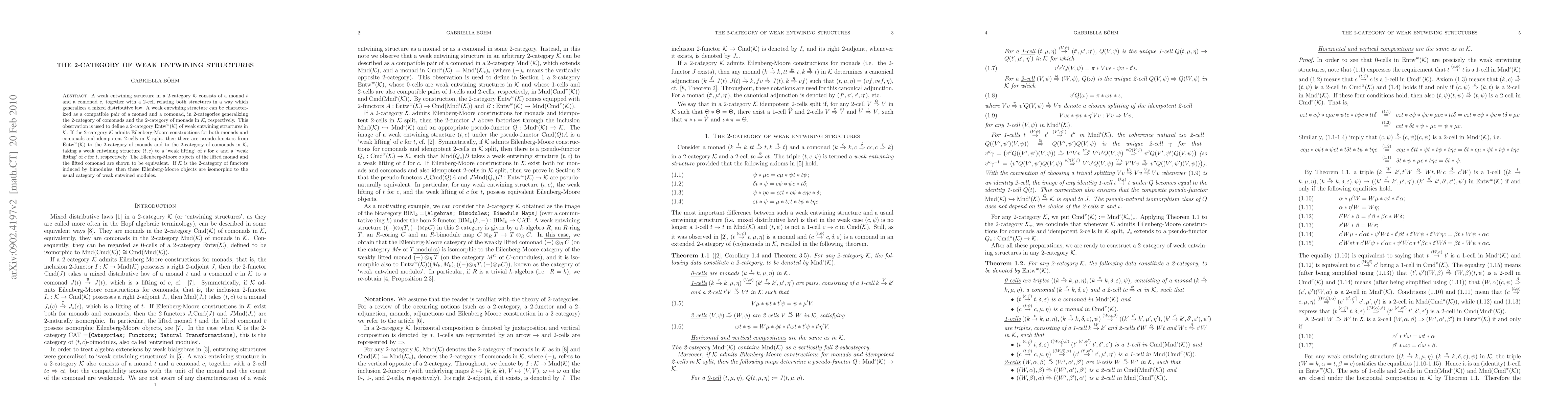 This paper introduces the 2-category Entw^w(K) of weak entwining structures in a 2-category K, characterized by a compatible pair of monad and comonad. It establishes pseudo-functors mapping weak entwining structures to respective monad and comonad categories, showing equivalence of Eilenberg-Moore objects under specific conditions.