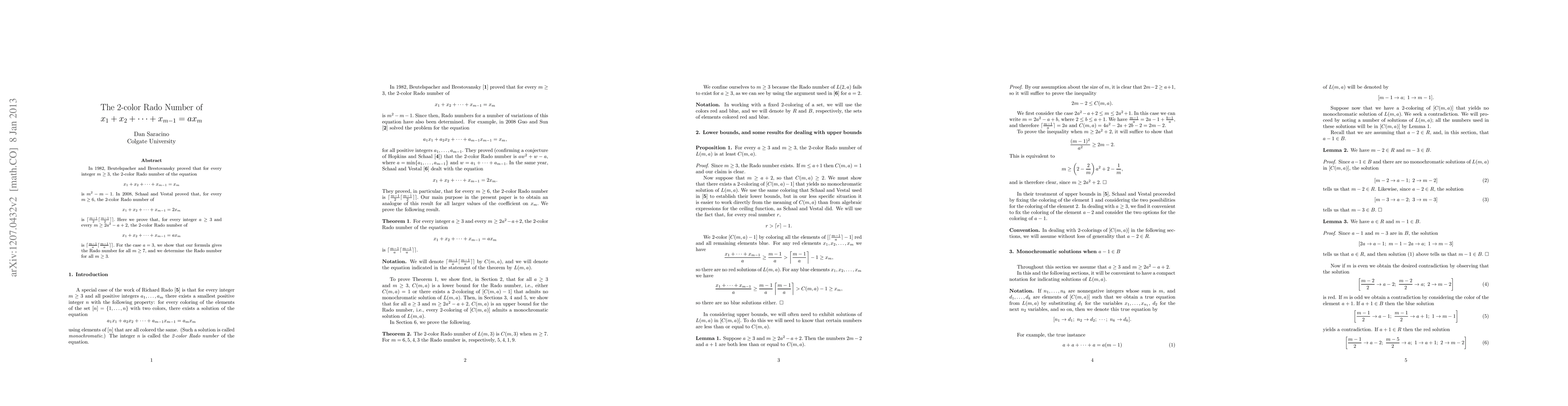 The research paper proves a general formula for the 2-color Rado number of a given equation, finding that it equals ≬rac{m-1}{a}≬rac{m-1}{a} for every integer $a eq3$ and every $m g aisebox{-0.85ex}{$igcirc$}2a^2-a+2$, with exceptions and specific cases also proven.