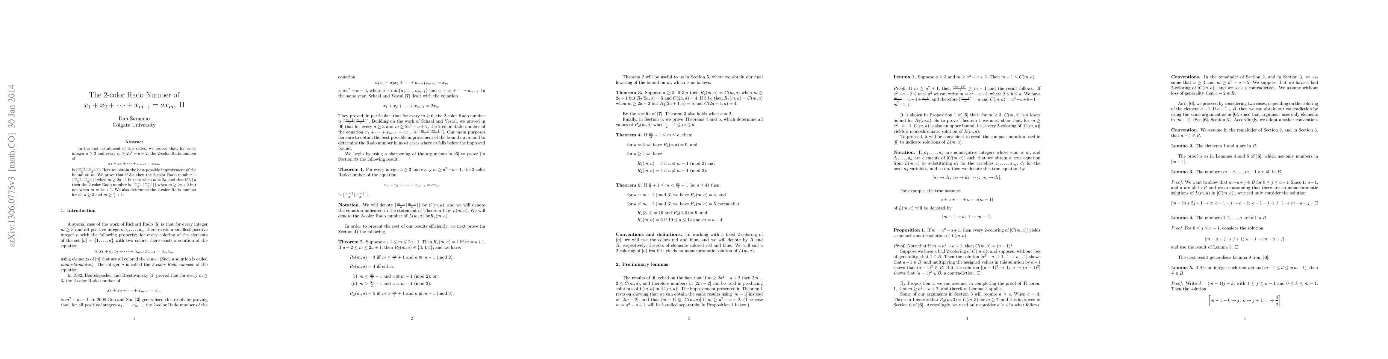 In the first installment of this series, we proved that, for every integer $a\geq 3$ and every $m\geq 2a^2-a+2$, the 2-color Rado number of $x_1 + x_2 + \cdots + x_{m-1} = ax_m$ is $\lceil\frac{m-1}{a} \lceil\frac{m-1}{a} \rceil\rceil$. Here we obtain the best possible improvement of the bound on $m.$ We prove that if $3|a$ then the 2-color Rado number is $\lceil\frac{m-1}{a} \lceil\frac{m-1}{a} \rceil\rceil$ when $m\geq 2a+1$ but not when $m=2a,$ and that if $3\nmid a$ then the 2-color Rado number is $\lceil\frac{m-1}{a} \lceil\frac{m-1}{a} \rceil\rceil$ when $m\geq 2a+2$ but not when $m=2a+1.$ We also determine the 2-color Rado number for all $a\geq 3$ and $m\geq \frac{a}{2}+1.$