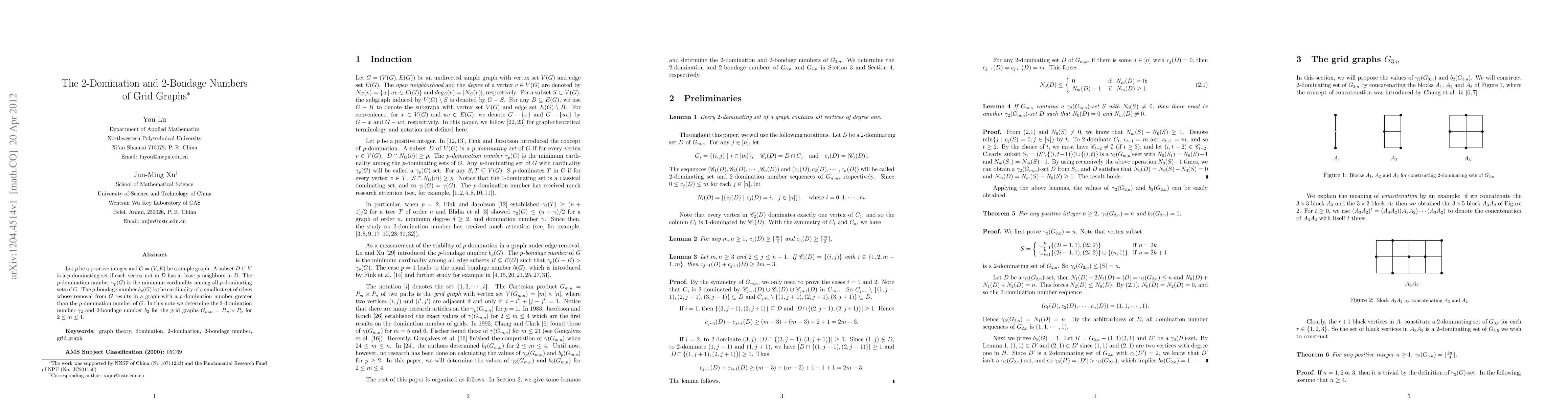 Let $p$ be a positive integer and $G=(V,E)$ be a simple graph. A subset $D\subseteq V$ is a $p$-dominating set if each vertex not in $D$ has at least $p$ neighbors in $D$. The $p$-domination number $\g_p(G)$ is the minimum cardinality among all $p$-dominating sets of $G$. The $p$-bondage number $b_p(G)$ is the cardinality of a smallest set of edges whose removal from $G$ results in a graph with a $p$-domination number greater than the $p$-domination number of $G$. In this note we determine the 2-domination number $\g_2$ and 2-bondage number $b_2$ for the grid graphs $G_{m,n}=P_m\times P_n$ for $2\leq m\leq 4$.