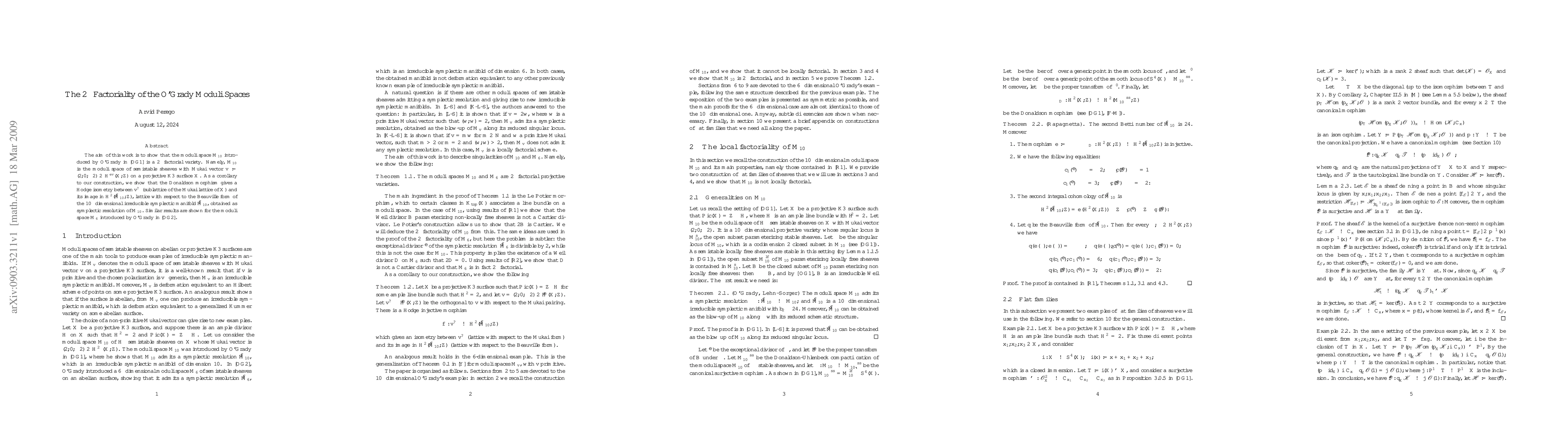 The aim of this work is to show that the moduli space $M_{10}$ introduced by O'Grady in \cite{OG1} is a $2-$factorial variety. Namely, $M_{10}$ is the moduli space of semistable sheaves with Mukai vector $v:=(2,0,-2)\in H^{ev}(X,\mathbb{Z})$ on a projective K3 surface $X$. As a corollary to our construction, we show that the Donaldson morphism gives a Hodge isometry between $v^{\perp}$ (sublattice of the Mukai lattice of $X$) and its image in $H^{2} (\widetilde{M}_{10},\mathbb{Z})$, lattice with respect to the Beauville form of the $10-$dimensional irreducible symplectic manifold $\widetilde{M}_{10}$, obtained as symplectic resolution of $M_{10}$. Similar results are shown for the moduli space $M_{6}$ introduced by O'Grady in \cite{OG2}.