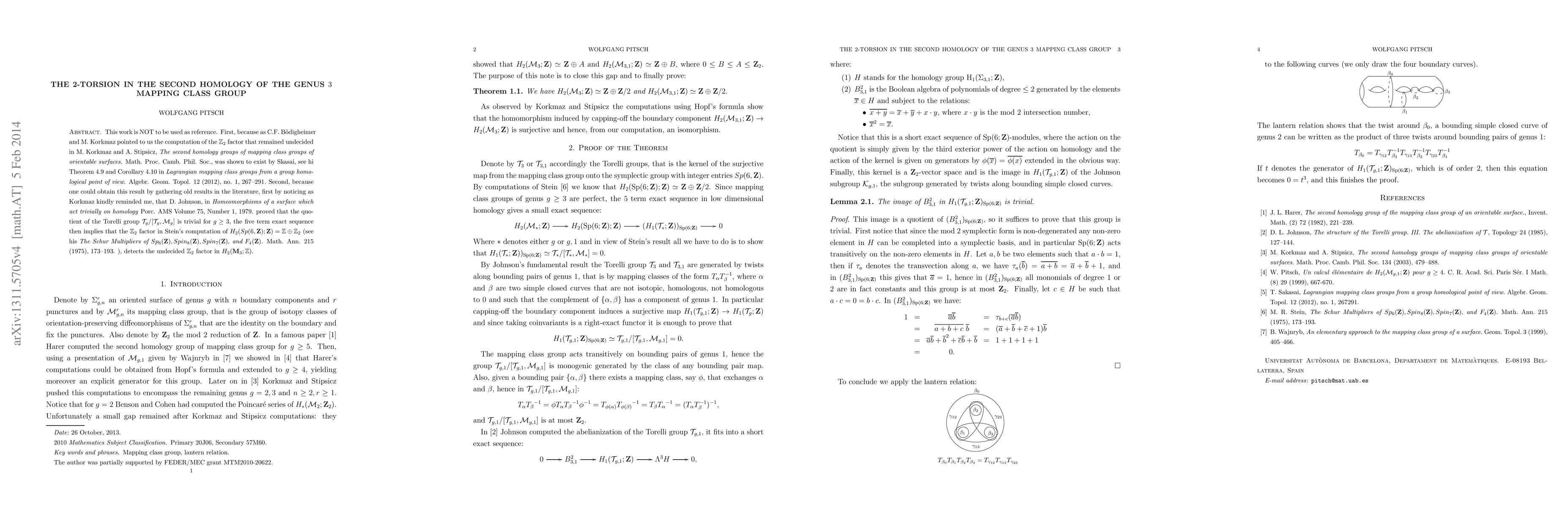 This work is NOT to be used as reference. First, because as C.F.~B\"odigheimer and M.~Korkmaz pointed to us the computation of the $\mathbf{Z}_2$ factor that remained undecided in M.~Korkmaz and A. Stipsicz, {\em The second homology groups of mapping class groups of orientable surfaces.} Math. Proc. Camb. Phil. Soc., was shown to exist by Skasai, see hi Theorem 4.9 and Corollary 4.10 in {\em Lagrangian mapping class groups from a group homological point of view.} Algebr. Geom. Topol. 12 (2012), no. 1, 267--291. Second, because one could obtain this result by gathering old results in the literature, first by noticing as Korkmaz kindly reminded me, that D.~Johnson, in \emph{Homeomorphisms of a surface which act trivially on homology} Porc. AMS Volume 75, Number 1, 1979. proved that the quotient of the Torelli group $\mathcal{T}_g/[\mathcal{T}_g,\mathcal{M}_g]$ is trivial for $g\geq 3$, the five term exact sequence then implies that the $\mathbf{Z}_2$ factor in Stein's computation of $H_2(Sp(6,\mathbf{Z});\mathbf{Z}) = \mathbf{Z}\oplus\mathbf{Z}_2$ (see his {\em The Schur Multipliers of $Sp_6(\mathbf{Z}), Spin_8(\mathbf{Z}), Spin_7(\mathbf{Z}),$ and $F_4(\mathbf{Z})$.} Math. Ann. 215 (1975), 173--193. ), detects the undecided $\mathbf{Z}_2$ factor in $H_2(\mathbf{M}_3;\mathbf{Z})$.