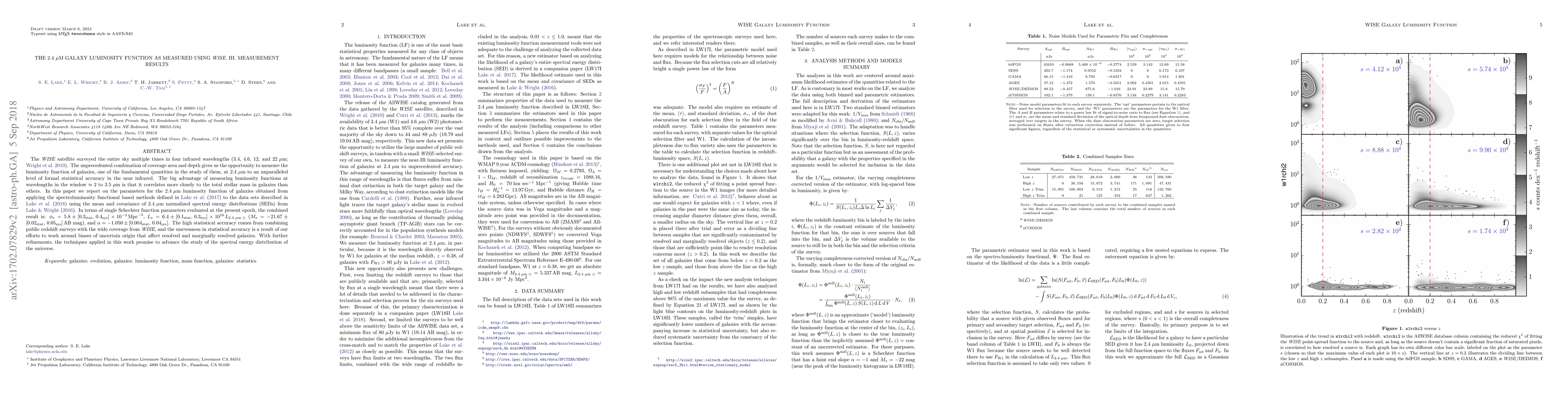 The WISE satellite surveyed the entire sky multiple times in four infrared wavelengths (3.4, 4.6, 12, and $22\,\mu$m; Wright et al. 2010). The unprecedented combination of coverage area and depth gives us the opportunity to measure the luminosity function of galaxies, one of the fundamental quantities in the study of them, at $2.4\ \mu$m to an unparalleled level of formal statistical accuracy in the near infrared. The big advantage of measuring luminosity functions at wavelengths in the window $\approx 2$ to $3.5\,\mu$m is that it correlates more closely to the total stellar mass in galaxies than others. In this paper we report on the parameters for the $2.4\,\mu$m luminosity function of galaxies obtained from applying the spectroluminosity functional based methods defined in Lake et al. (2017b) to the data sets described in Lake et al. (2017a) using the mean and covariance of $2.4\,\mu$m normalized SEDs from Lake & Wright (2016). In terms of single Schechter function parameters evaluated at the present epoch, the combined result is: $\phi_\star = 5.8 \pm [0.3_{\mathrm{stat}},\, 0.3_{\mathrm{sys}}] \times 10^{-3} \operatorname{Mpc}^{-3}$, $L_\star = 6.4 \pm [0.1_{\mathrm{stat}},\, 0.3_{\mathrm{sys}}] \times 10^{10}\, L_{2.4\,\mu\mathrm{m}\,\odot}$ ($M_\star = -21.67 \pm [0.02_{\mathrm{stat}},\, 0.05_{\mathrm{sys}}]\operatorname{AB\ mag}$), and $\alpha = -1.050 \pm [0.004_{\mathrm{stat}},\, 0.03_{\mathrm{sys}}]$, corresponding to a galaxy number density of $0.08\operatorname{Mpc}^{-3}$ brighter than $10^6\, L_{2.4\,\mu\mathrm{m}\,\odot}$ ($10^{-3} \operatorname{Mpc}^{-3}$ brighter than $L_\star$) and a $2.4\,\mu$m luminosity density equivalent to $3.8\times10^{8}\,L_{2.4\,\mu\mathrm{m}\,\odot}\operatorname{Mpc}^{-3}$. $\ldots$