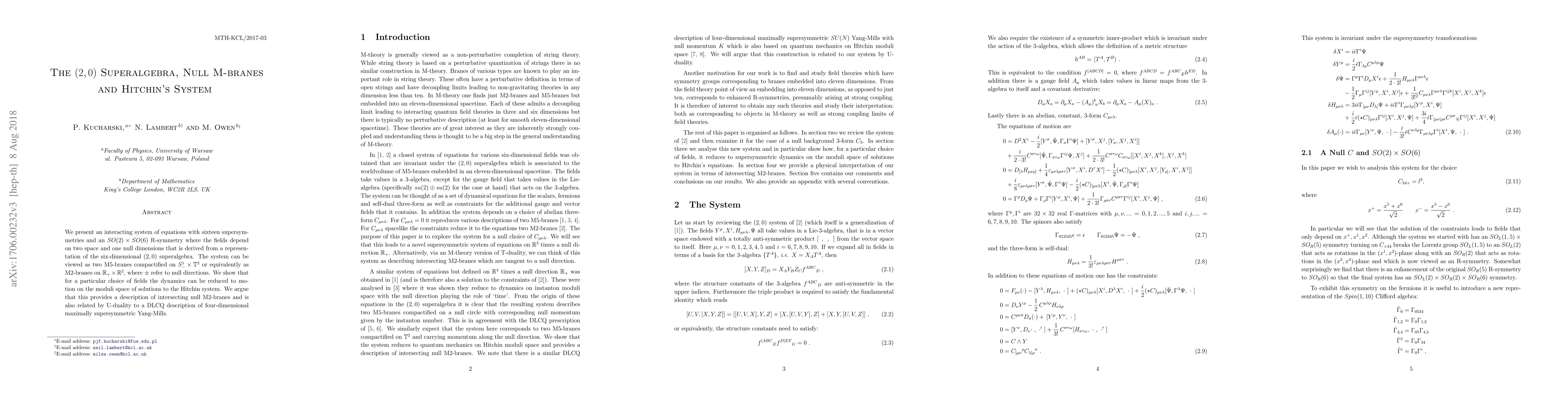 This paper explores a supersymmetric system derived from the (2,0) superalgebra, describing intersecting null M2-branes. It reduces to the dynamics of Hitchin's system, linking it to a U-duality-related description of four-dimensional maximally supersymmetric Yang-Mills.