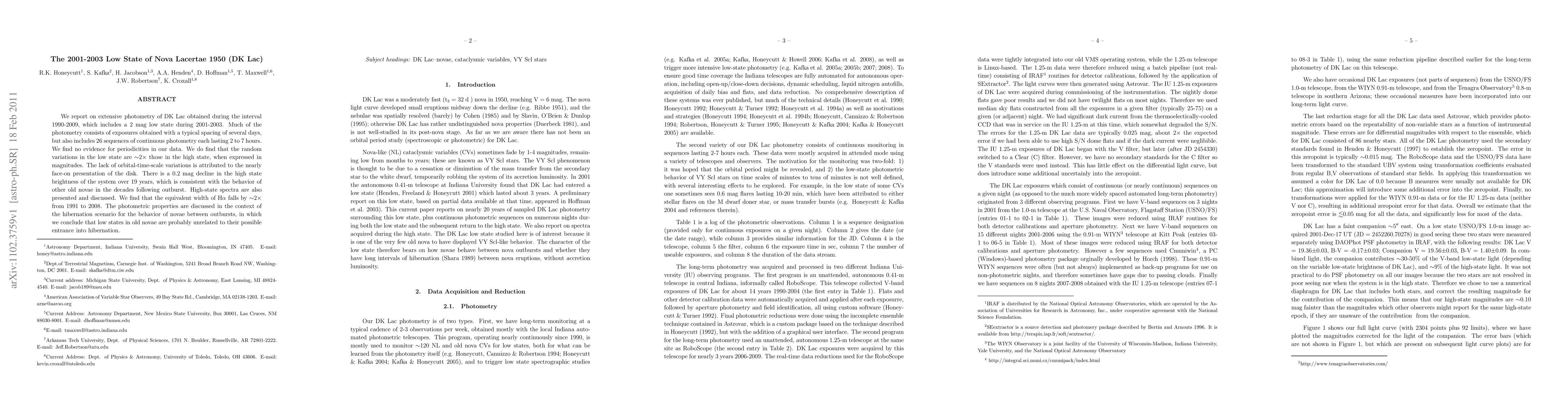 We report on extensive photometry of DK Lac obtained during the interval 1990-2009, which includes a 2 mag low state during 2001-2003. Much of the photometry consists of exposures obtained with a typical spacing of several days, but also includes 26 sequences of continuous photometry each lasting 2 to 7 hours. We find no evidence for periodicities in our data. We do find that the random variations in the low state are ~2x those in the high state, when expressed in magnitudes. The lack of orbital-time-scale variations is attributed to the nearly face-on presentation of the disk. There is a 0.2 mag decline in the high state brightness of the system over 19 years, which is consistent with the behavior of other old novae in the decades following outburst. High-state spectra are also presented and discussed. We find that the equivalent width of H$\alpha$ falls by ~2x from 1991 to 2008. The photometric properties are discussed in the context of the hibernation scenario for the behavior of novae between outbursts, in which we conclude that low states in old novae are probably unrelated to their possible entrance into hibernation.